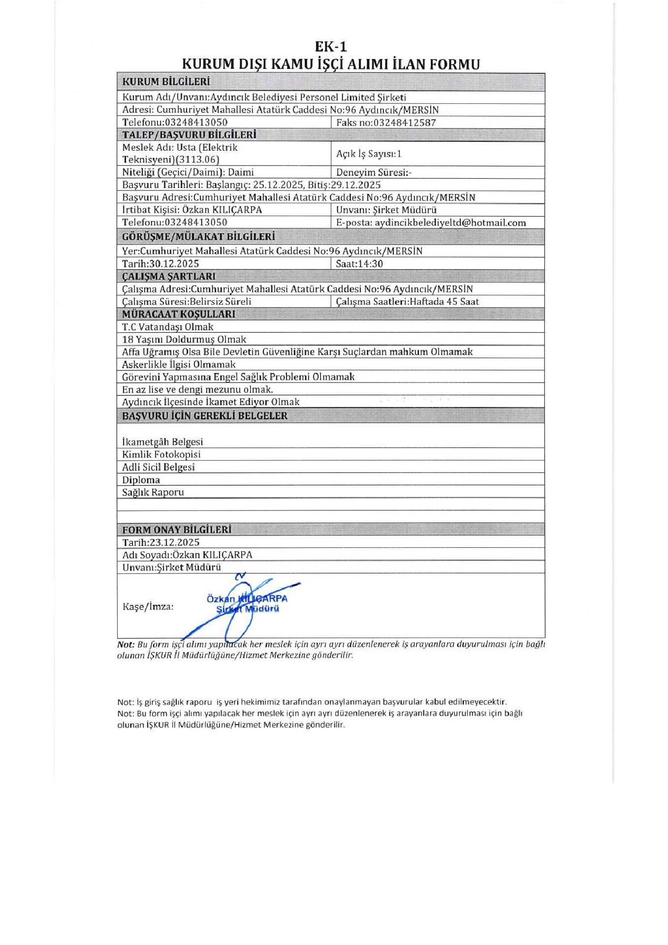 Ana sayfaDaimi İşçi İlanları Mersin Aydıncık Belediyesi 1 İşçi Alacak Mersin Aydıncık Belediyesi 1 İşçi Alacak. Son başvuru tarihi 29 Aralık 2025 Kaynak : İşkur İlan Giriş : 25 Aralık 2025 01:03, Son Güncelleme : 25 Aralık 2025 01:57 Yazdır Yorumlar (0) Abone Ol