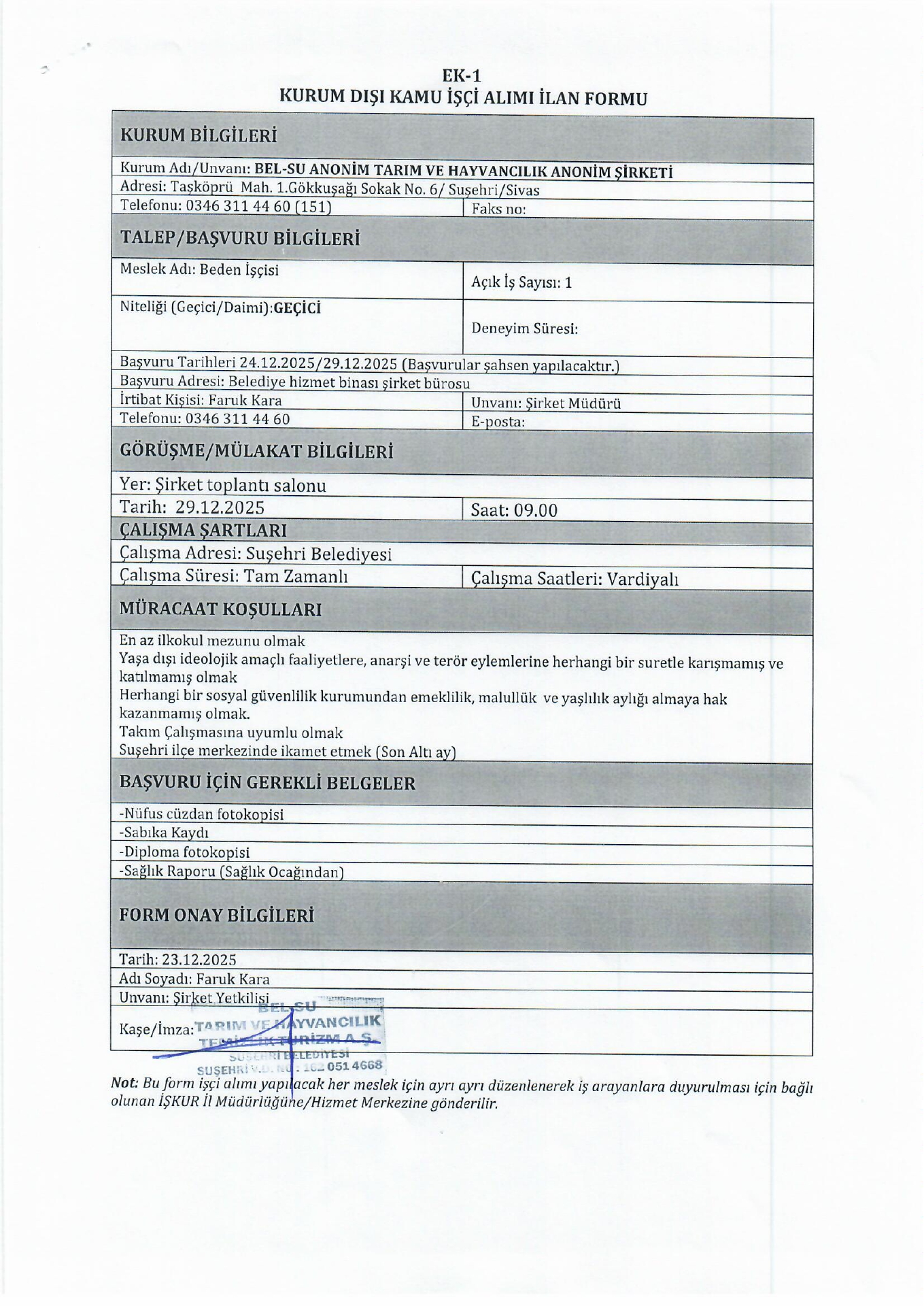Ana sayfaGeçici İşçi İlanları Sivas Suşehri Belediyesi Geçici 1 İşçi Alacak Sivas Suşehri Belediyesi Geçici 1 İşçi Alacak. Son başvuru tarihi 29 Aralık 2025 Kaynak : İşkur İlan Giriş : 25 Aralık 2025 01:22, Son Güncelleme : 25 Aralık 2025 01:52 Yazdır Yorumlar (0) Abone Ol