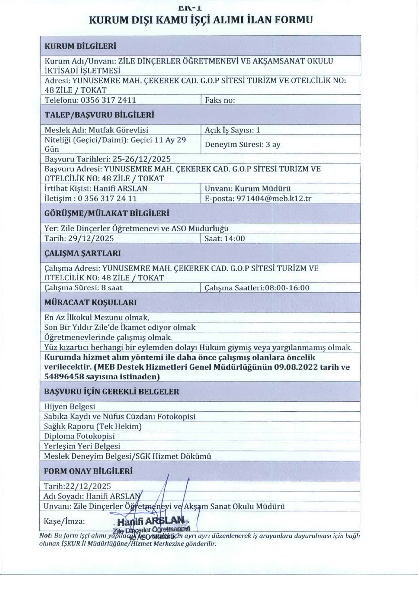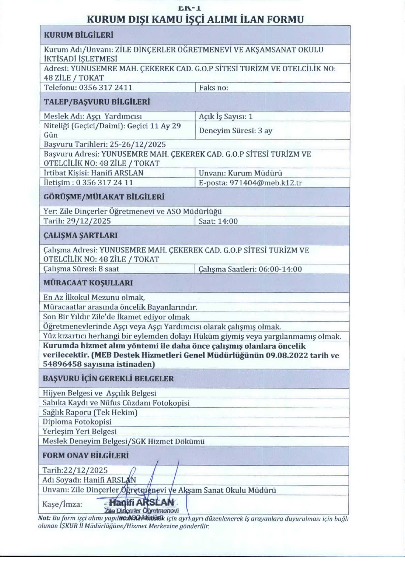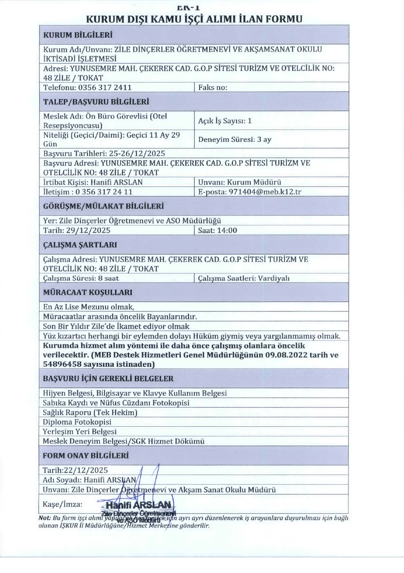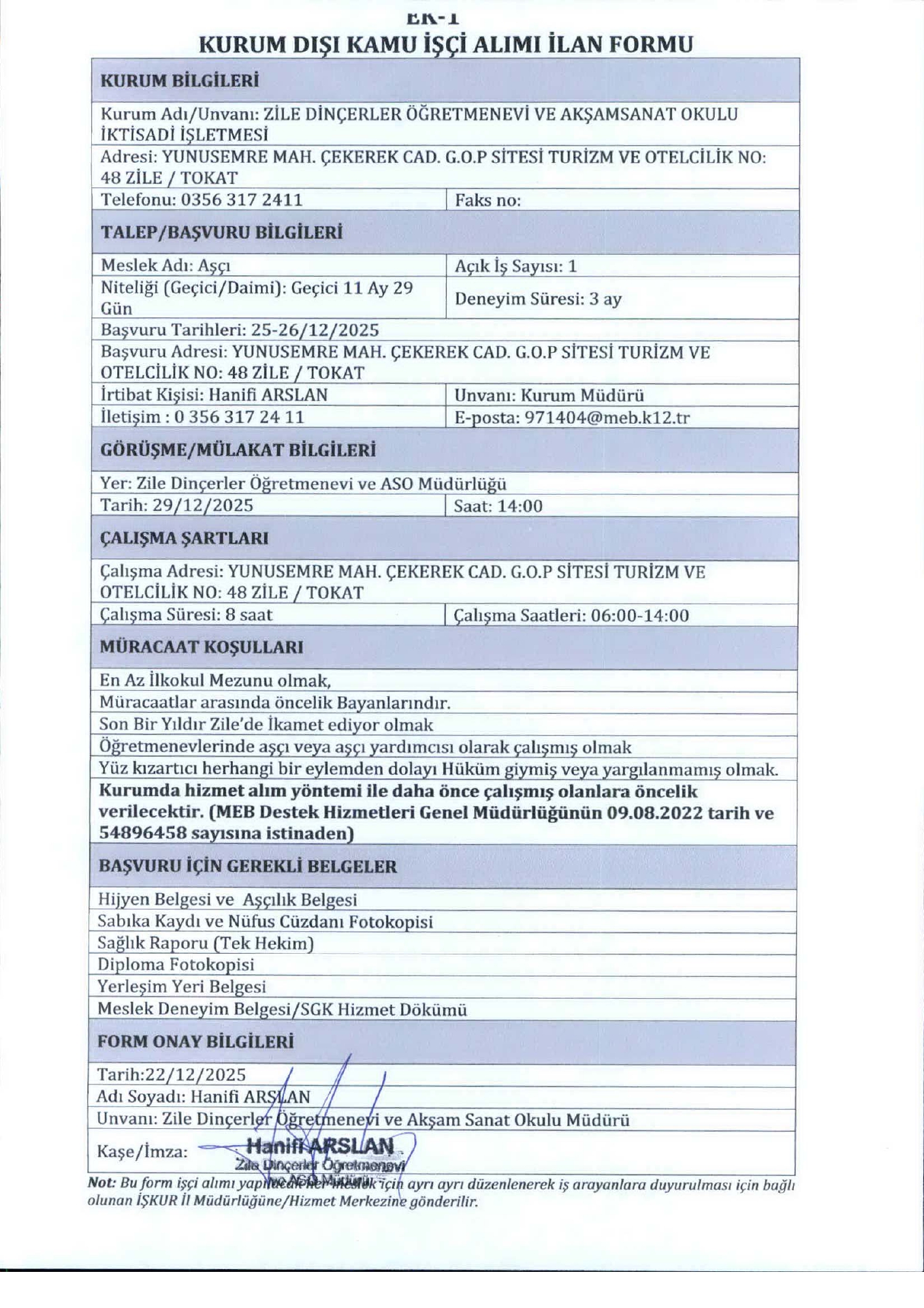Tokat Zile Dinçerler Öğretmenevi Geçici 4 İşçi Alacak. Son başvuru tarihi 26 Aralık 2025