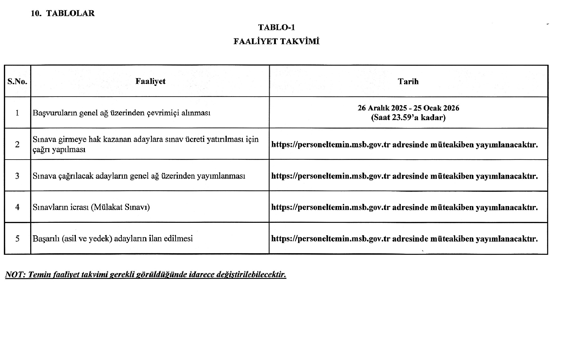 a) Başvurular 26 Aralık 2025 - 25 Ocak 2026 tarihleri arasında https://personeltemin.msb.gov.tradresi üzerinden e-Devlet şifresi ile çevrimiçi yapılacaktır.