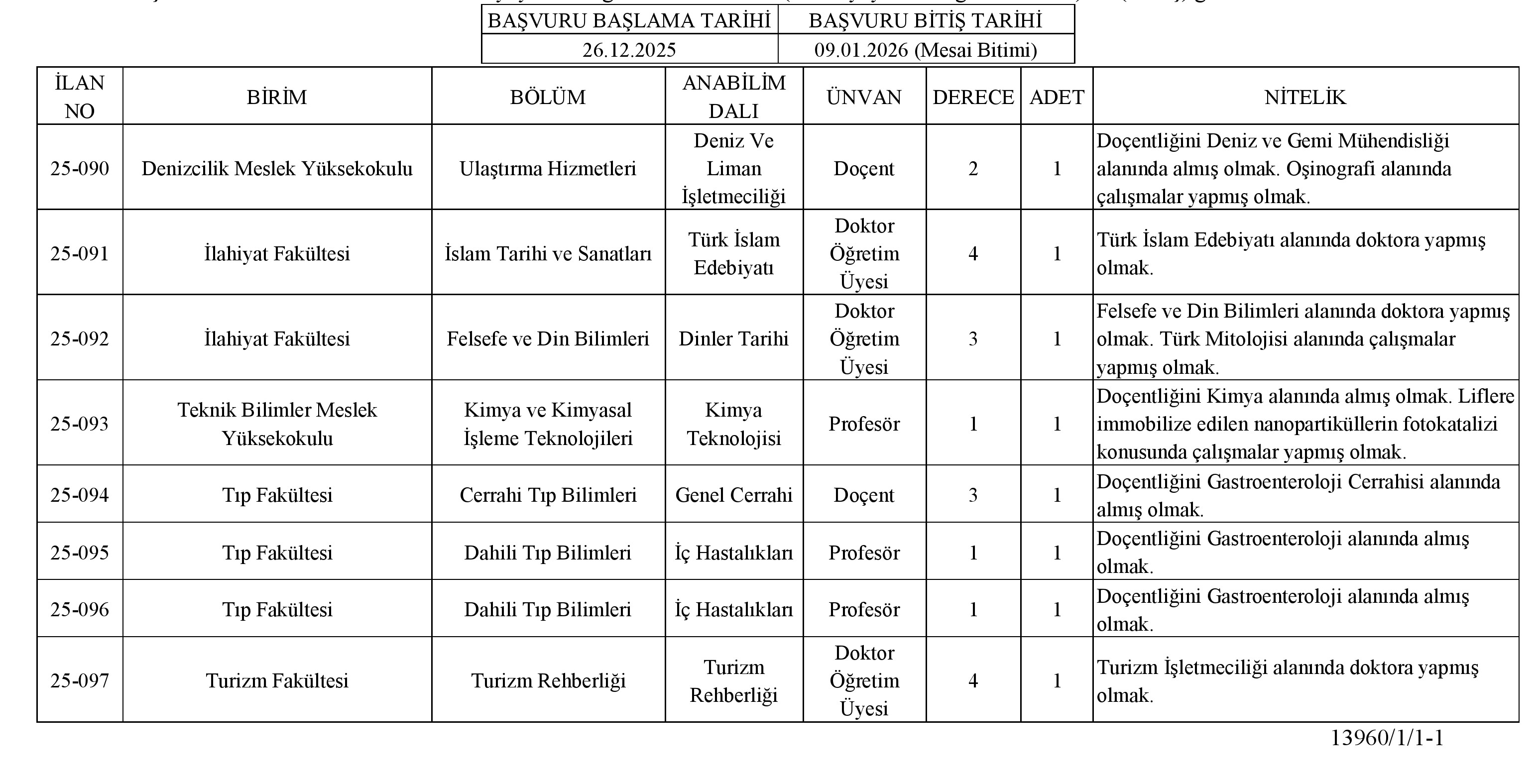 - Profesör ve Doçent kadrosu için Personel Daire Başkanlığına şahsen veya posta ile başvurulması gerekmektedir.