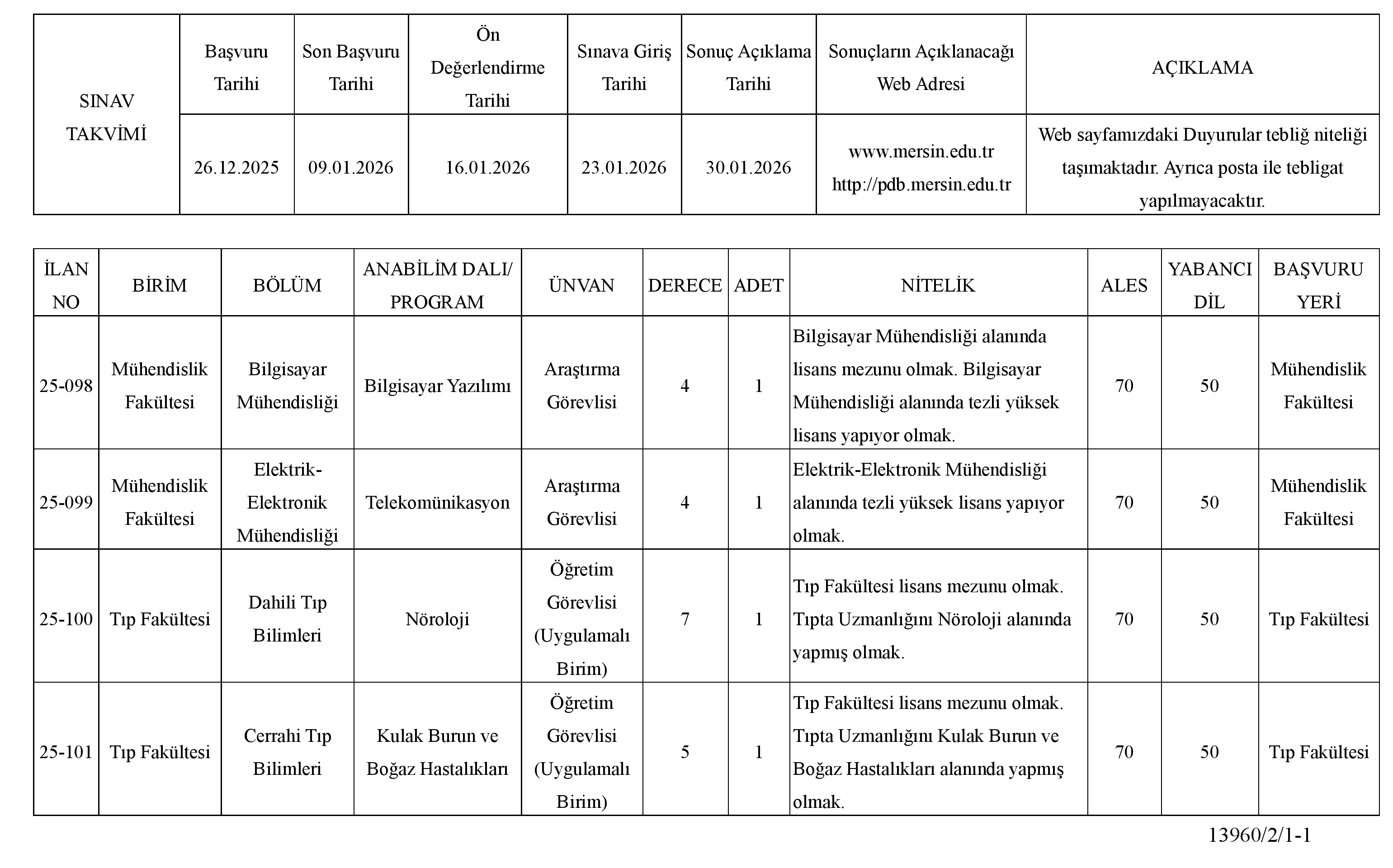 Mersin Üniversitesi Öğretim Üyesi ve Elemanı Alım İlanı. Son başvuru tarih 9 Ocak 2026
