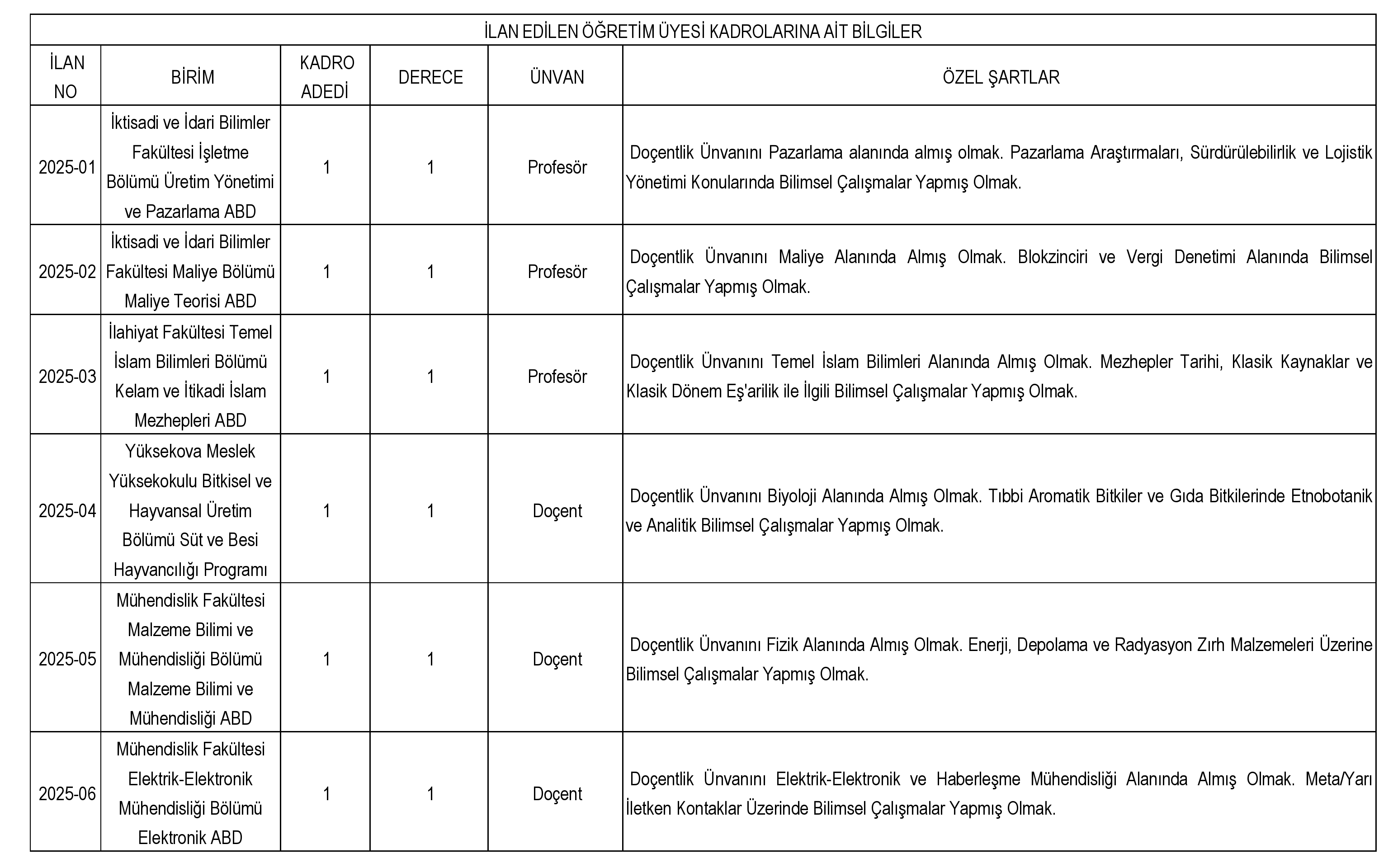 Hakkari Üniversitesi Öğretim Üyesi ve Elemanı Alım İlanı. Son başvuru tarih 10 Ocak 2026