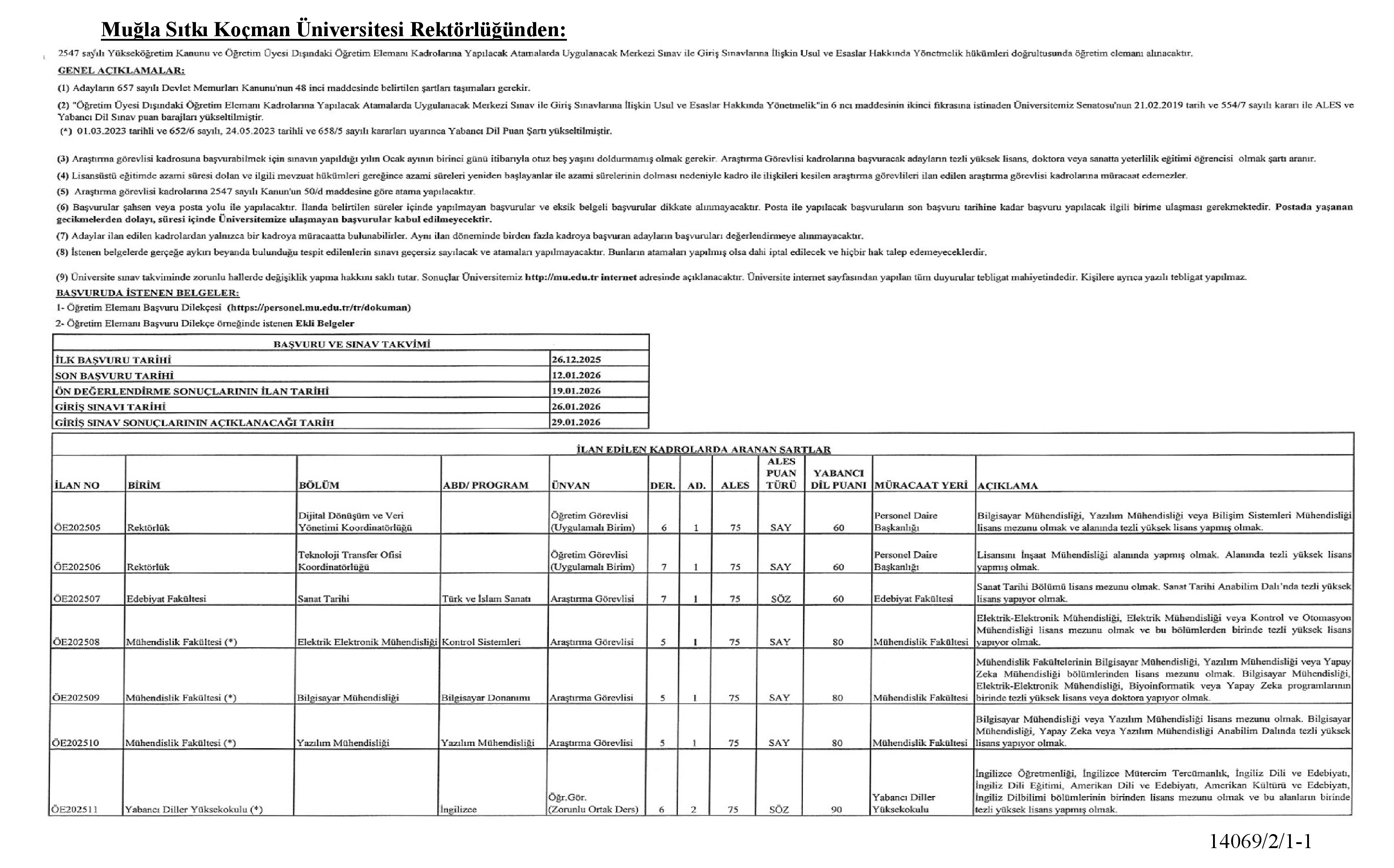 Muğla Sıtkı Koçman Üniversitesi Öğretim Üyesi ve Elemanı Alım İlanı. Son başvuru tarih 9 Ocak 2026