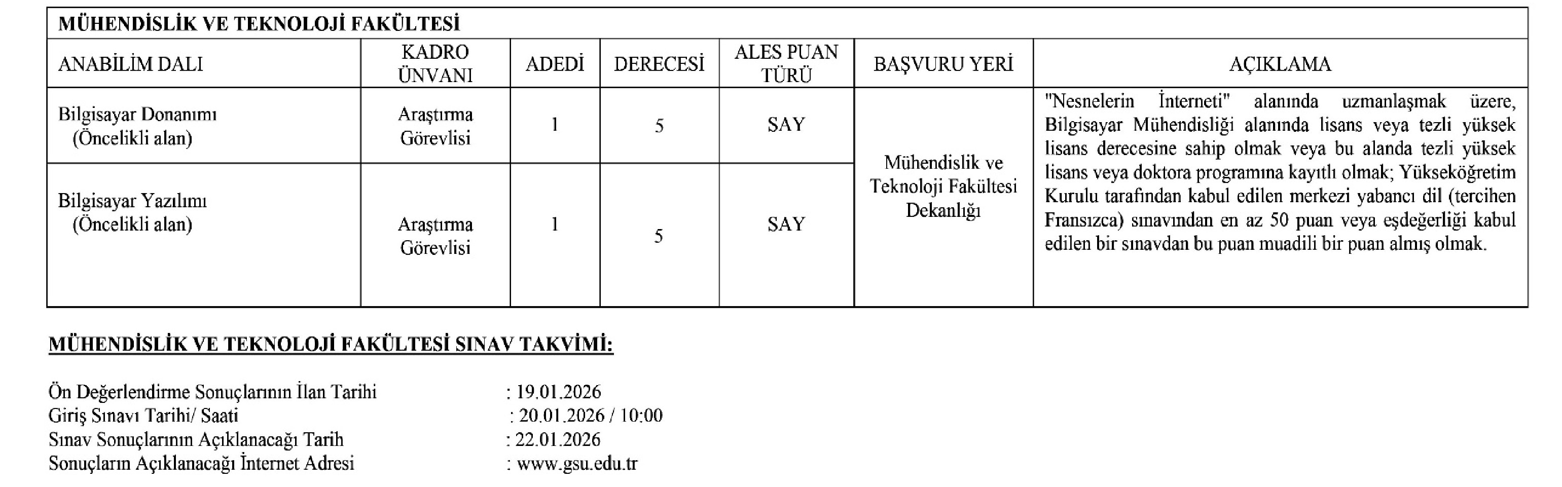 Üniversitemize 10.07.2018 tarihli Resmi Gazete'de yayımlanan Genel Kadro ve Usulü Hakkında 2 sayılı Cumhurbaşkanlığı Kararnamesi, 2547 sayılı Yükseköğretim Kanunu nun ilgili maddeleri ve 09.11.2018 tarihli ve 30590 sayılı Resmi Gazete'de yayımlanarak yürürlüğe giren "Öğretim Üyesi Dışındaki Öğretim Elemanı Kadrolarına Yapılacak Atamalarda Uygulanacak Merkezi Sınav ile Giriş Sınavlarına İlişkin Usul ve Esaslar Hakkında Yönetmelik"in ilgili maddelerine göre Araştırma Görevlisi (Öncelikli alan) alınacaktır.