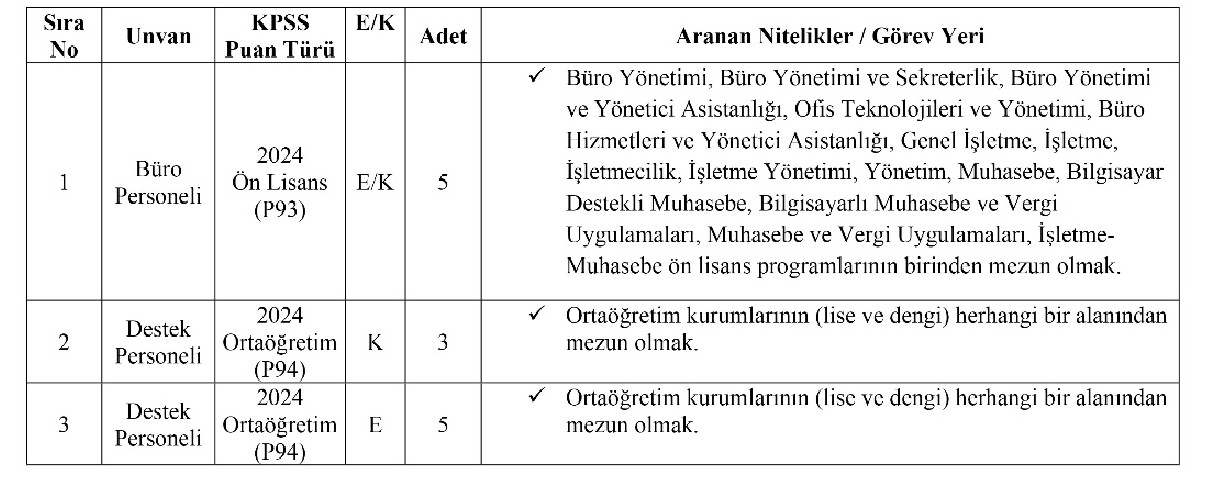 4- 2024 yılı KPSS (B) grubu sınavına girmiş ve geçerli bir puan almış olmak. Lisans düzeyi için KPSSP3, Ön lisans düzeyi için KPSSP93 ve ortaöğretim düzeyi için KPSSP94 puanı esas alınacaktır. Adayların KPSS puanının, başvurduğu ilanın KPSS puan türüne uygun olması gerekmekledir.