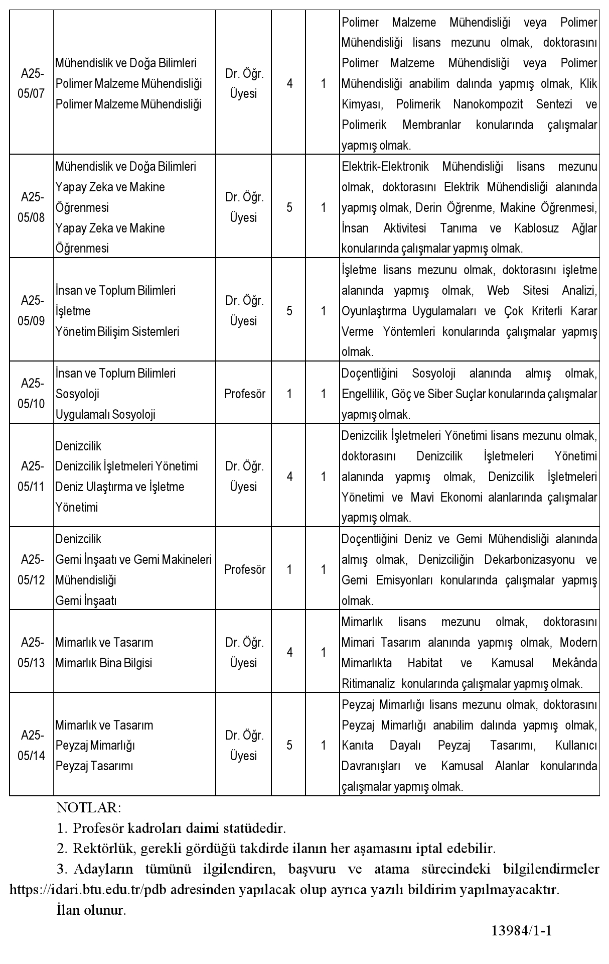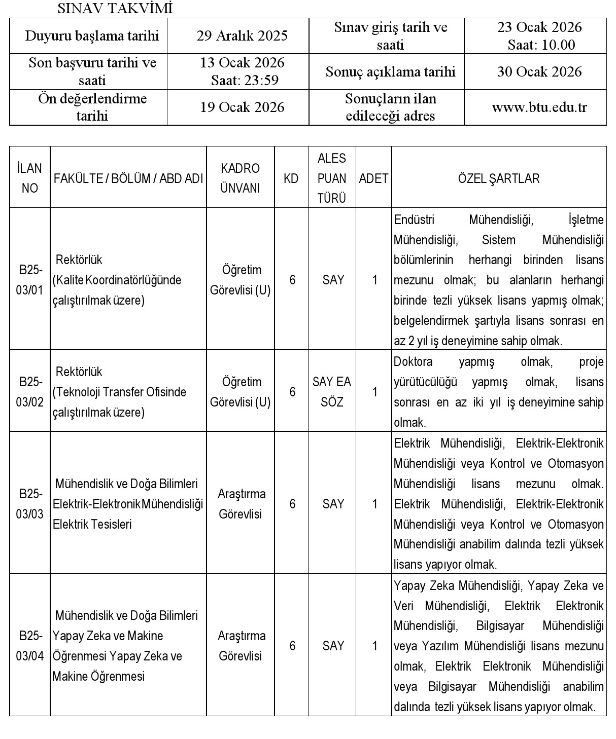 3. Adayların tümünü ilgilendiren, başvuru ve atama sürecindeki bilgilendirmeler https://idari.btu.edu.tr/pdb adresinden yapılacak olup ayrıca yazılı bildirim yapılmayacaktır.