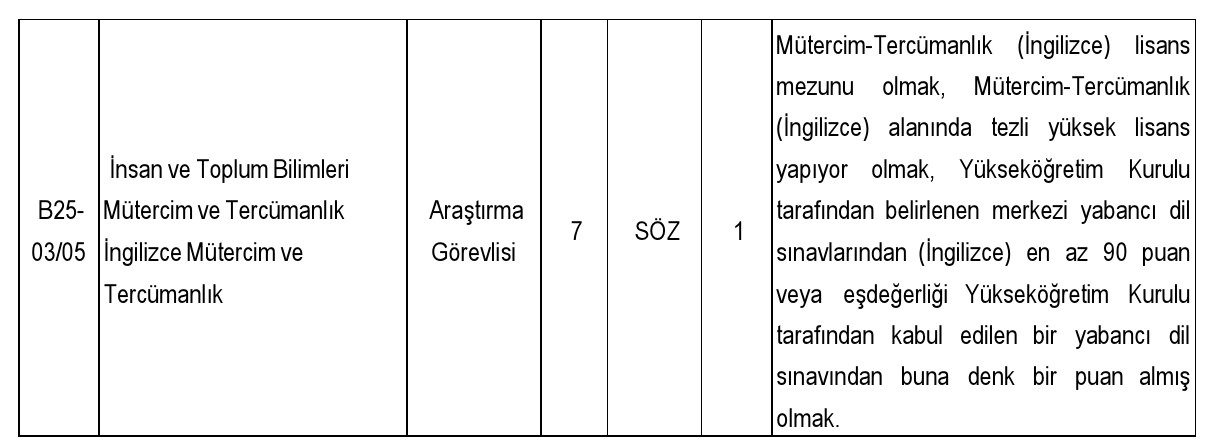 1- Öğretim Görevlisi ve Araştırma Görevlisi kadrolarına başvuracak adayların Öğretim Üyesi Dışındaki Öğretim Elemanı Kadrolarına Yapılacak Atamalarda Uygulanacak Merkezi Sınav ile Giriş Sınavlarına İlişkin Usul ve Esaslar Hakkında Yönetmelik' te belirlenen şartları sağlamaları gerekir. ALES'ten en az 70, Yükseköğretim Kurulu tarafından kabul edilen merkezi yabancı dil sınavından en az 50 puan veya eşdeğerliği kabul edilen bir sınavdan bu puan muadili bir puan almış olmak gerekir. Merkezi sınav muafiyetinden yararlanmayı talep edenlerin ön değerlendirme ve nihai değerlendirme aşamalarında ALES puanı 70 olarak kabul edilir.
