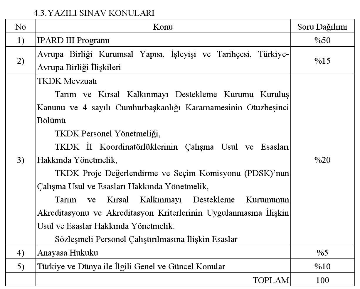Tarım ve Kırsal Kalkınmayı Destekleme Kurumu merkez ve taşra teşkilatında çalıştırılmak üzere 375 sayılı Kanun Hükmünde Kararnamenin ek 27 inci maddesi ile 20/01/2021 tarih ve 31370 sayılı Resmi Gazetede yayımlanan Tarım ve Kırsal Kalkınmayı Destekleme Kurumu Personel Yönetmeliğinin 6 ila 15 inci maddeleri hükümlerine göre açıktan atama yoluyla 42 uzman sözleşmeli personel alımı için yazılı ve sözlü olarak seçme sınavı yapılacaktır.
