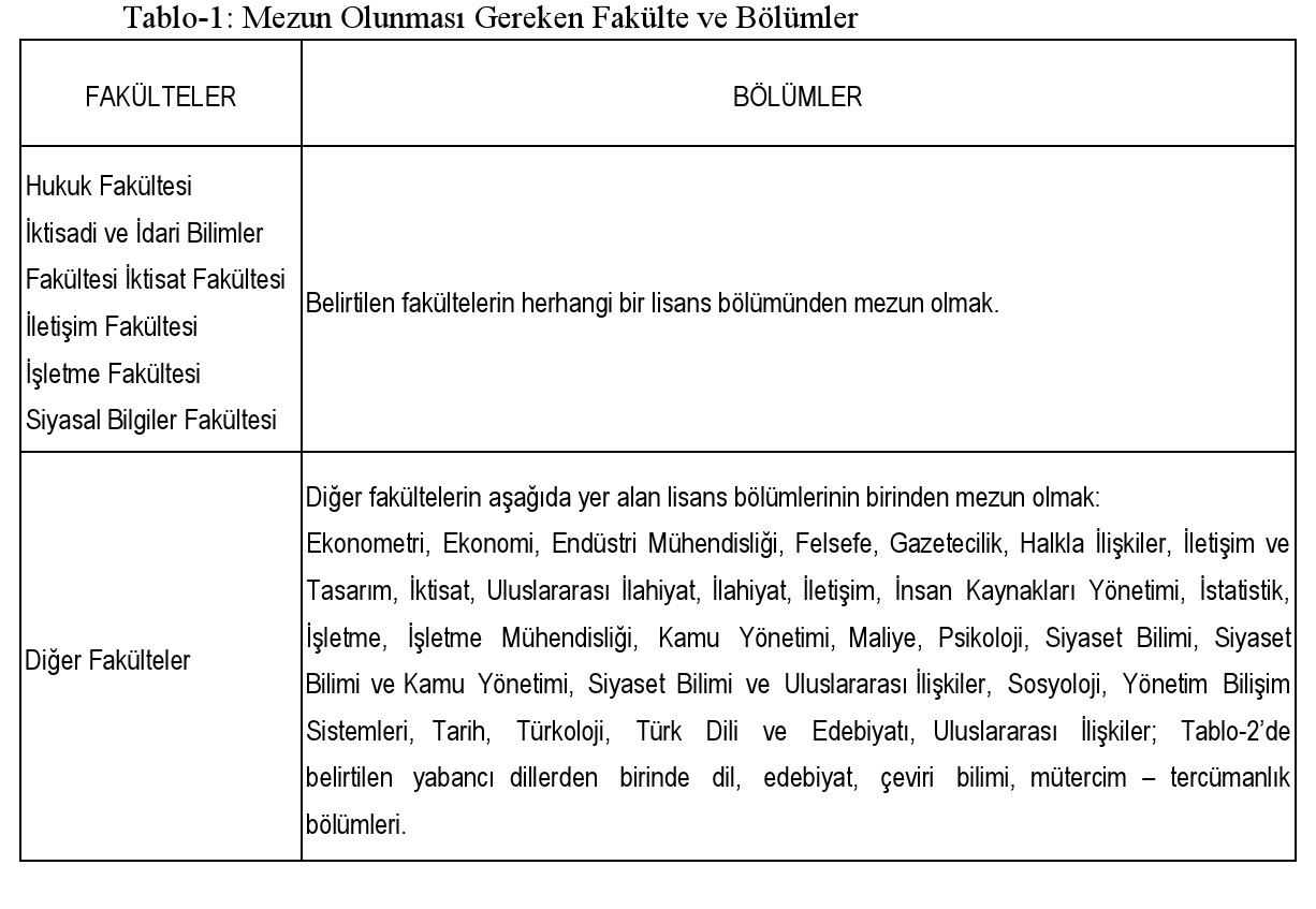 3- En az dört yıllık lisans eğitimi veren fakültelerin Tablo-1'de belirtilen bölümlerinden ya da bunlara denkliği Yükseköğretim Kurulu (YÖK) tarafından onaylanmış yurt içindeki veya yurt dışındaki yükseköğretim kurumlarından mezun olmak (Eğitimini yurt dışında tamamlamış adayların denklik belgelerini sisteme yüklemeleri gerekmektedir.) Eğitimini yurt dışında tamamlamış olup denklik belgesini sisteme yüklemeyen adaylar eleme sınavına alınmayacaktır.)