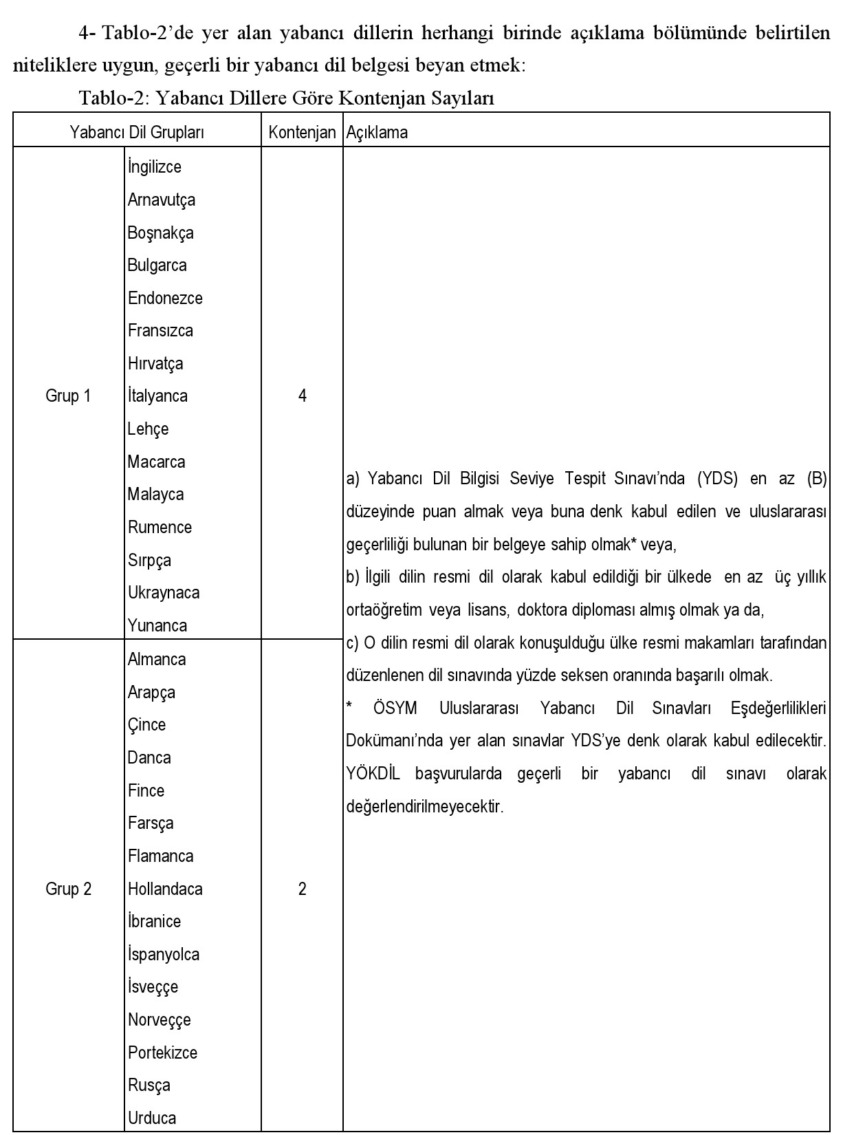 2- Alım yapılması planlanan yabancı dil gruplarına göre kontenjanlar Tablo-2'de belirtilmiştir. Adaylar, Tablo-2'de ilan edilen yabancı dil gruplarından sadece birini tercih edebilecektir. Bir dil grubuna yapılan başvurular arasında yazılı sınava katılmaya hak kazanan veya sözlü sınava katılmaya hak kazanan veya sözlü sınavda başarılı olan aday sayısının söz konusu dil grubu için ayrılmış kontenjandan daha az olması halinde, söz konusu dil grubu için ayrılmış kontenjan farkı başka bir dil grubuna aktarılabilir.