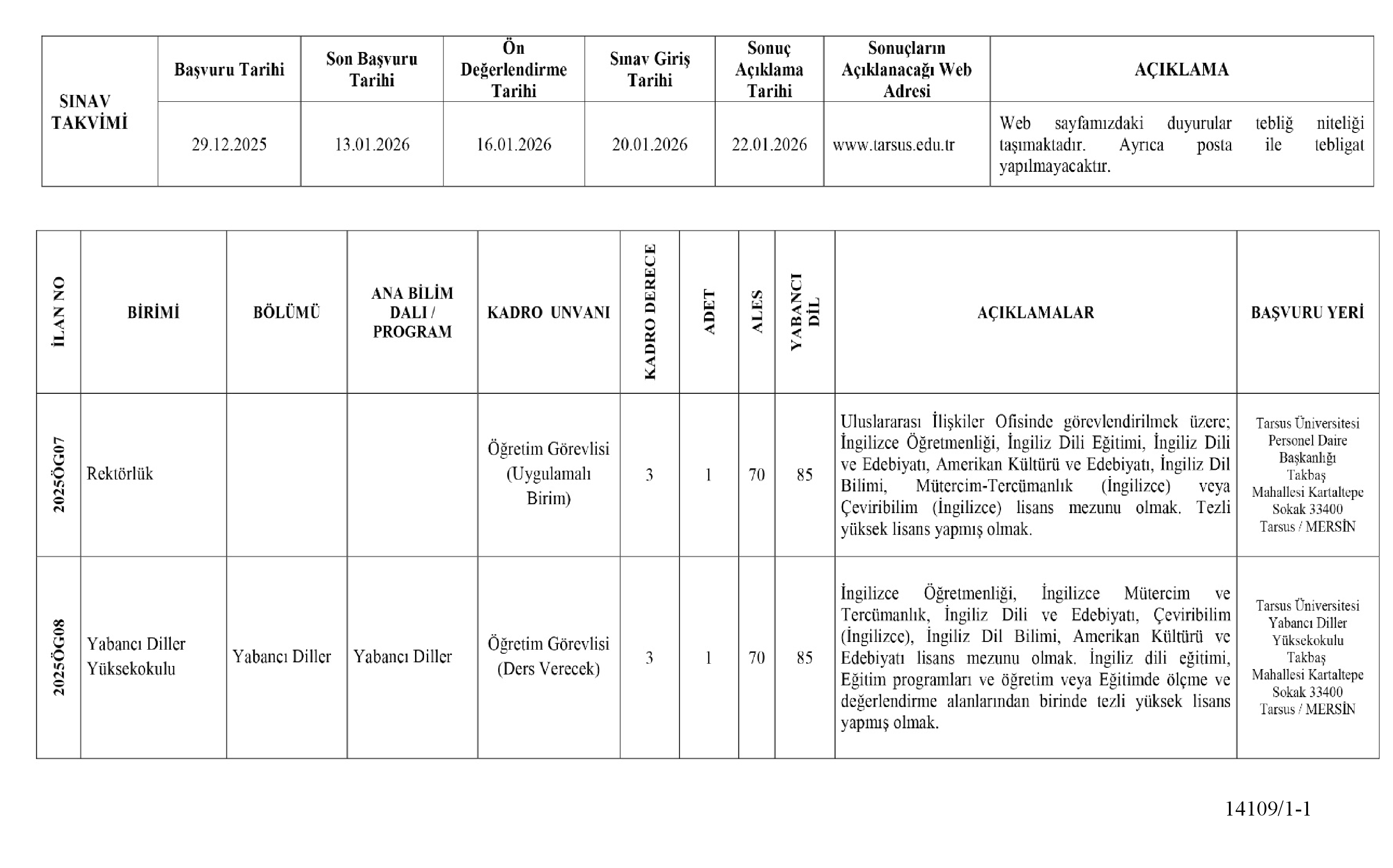 1) Başvurular, şalisen veya posta yoluyla ilan metninde belirtilen başvuru yerlerine yapılacaktır, İlan edilen kadrolardan sadece birine müracaat edilecektir. Birden fazla kadroya başvuru yapanların başvurusu geçersiz sayılacaktır. Eksik belgeli başvurular ile posta yoluyla yapılan başvurularda 13,01.2026 mesai bitiminden sonra Üniversitemize ulaşacak başvurular dikkate alınmayacaktır.