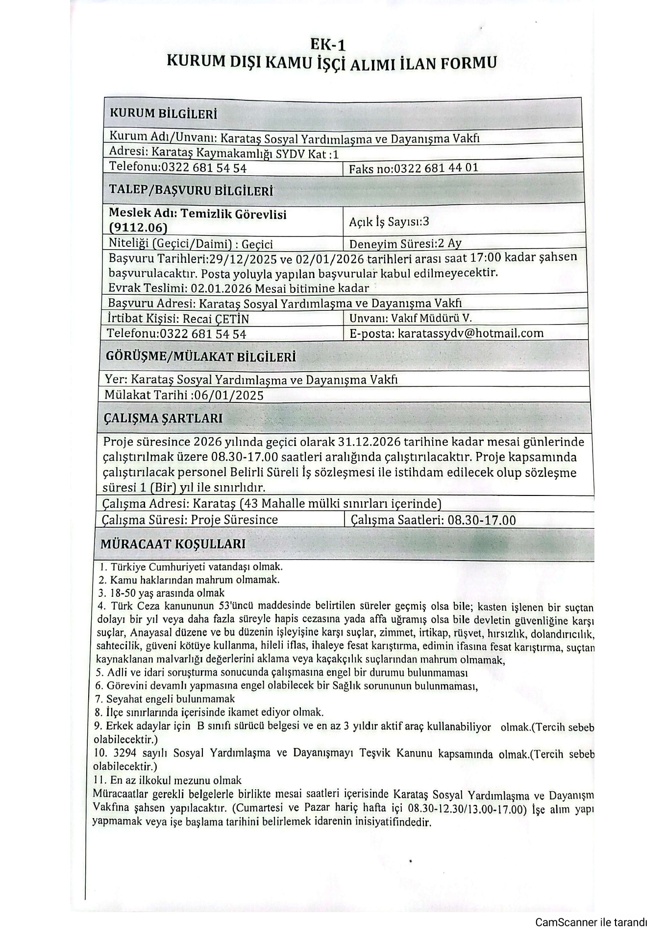 Ana sayfaSYDV İlanlarıAna sayfaGeçici İşçi İlanları Adana Karataş SYDV Geçici 3 İşçi Alacak Adana Karataş SYDV Geçici 3 İşçi Alacak. Son başvuru tarihi 2 Ocak 2026 Kaynak : İşkur İlan Giriş : 29 Aralık 2025 23:06, Son Güncelleme : 30 Aralık 2025 05:13 Yazdır Yorumlar (0) Abone Ol