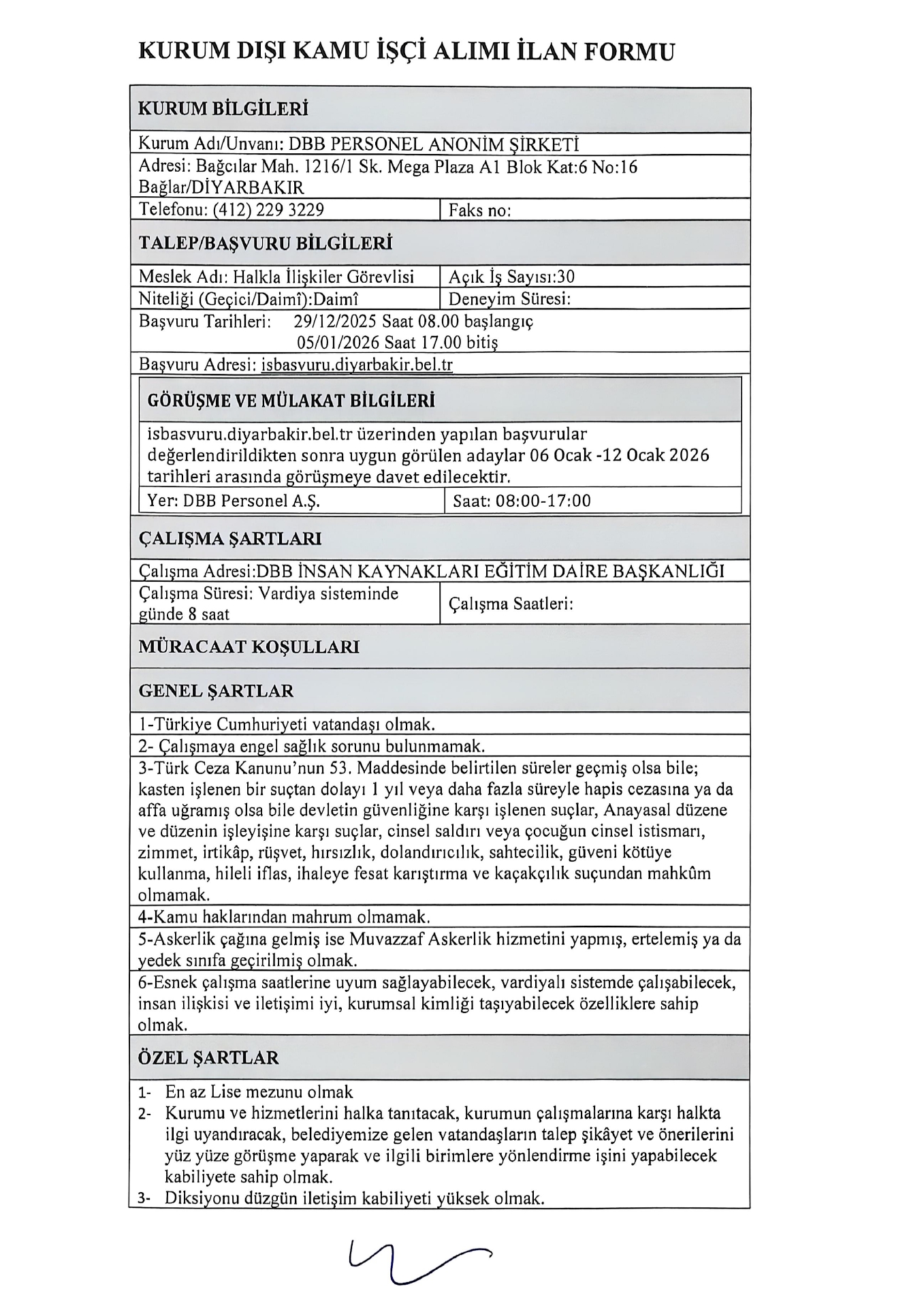 Ana sayfaDaimi İşçi İlanları Diyarbakır Büyükşehir Belediyesi 30 İşçi Alacak Diyarbakır Büyükşehir Belediyesi 30 İşçi Alacak. Son başvuru tarihi 5 Ocak 2026 Kaynak : İşkur İlan Giriş : 29 Aralık 2025 23:38, Son Güncelleme : 30 Aralık 2025 05:04 Yazdır Yorumlar (0) Abone Ol