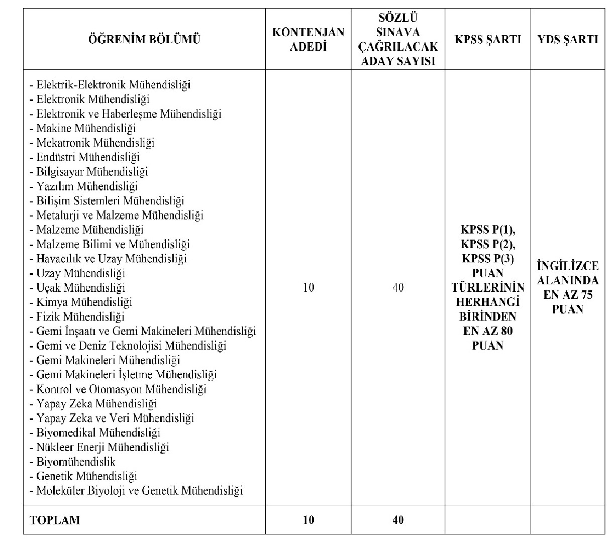 (1) Savunma Sanayii Başkanlığında Genel idare Hizmetleri sınıfından kadrolara atanmak üzere. Giriş Sınavı (Sözlü Sınav Yöntemi) ile aşağıda yer alan öğrenim bölümleri ve öğrenim bölümü karşısında belirtilen kontenjan adedi kadar Savunma Sanayii Uzman Yardımcısı alınacaktır: