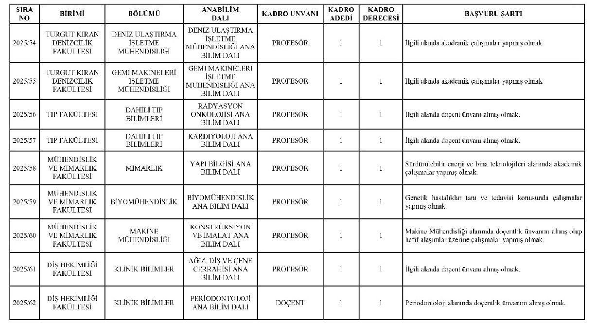 - Recep Tayyip Erdoğan Üniversitesi Öğretim Üyeliğine Yükseltilme ve Atanma Yönergesinin 11. maddesi kapsamında aşağıda belirtilen kadrolara atama yapılabilir.