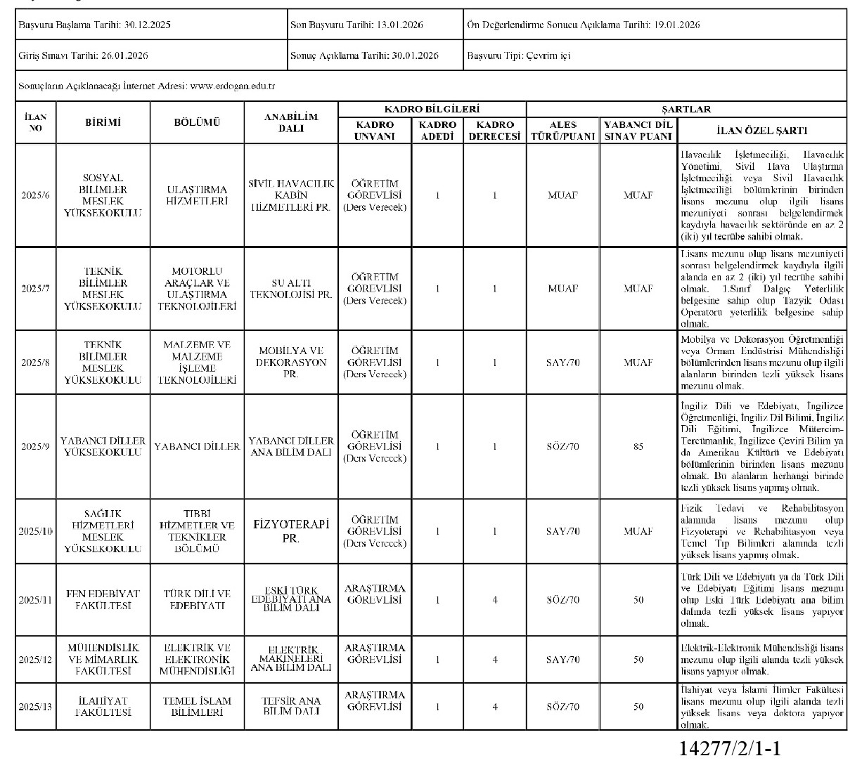 2547 sayılı Kanun ve Öğretim Üyesi Dışındaki Öğretim Elemanı Kadrolarına Yapılacak Atamalarda Uygulanacak Merkezi Sınav İle Giriş Sınavlarına İlişkin Usu! ve Esaslar Hakkında Yönetmelik uyarınca Üniversitemizin aşağıda belirtilen birimine öğretim elemanı alımı yapılacaktır. Başvurular ilanın Resmi Gazete'de yayımlandığı tarihten itibaren 15 (on beş) gün içinde çevrim içi olarak basvuru.erdogan.edu.tr adresinden yapılacaktır. Şalisen veya posta ile yapılan başvurular geçerli kabul edilmeyecektir. İdare gerekli gördüğü takdirde ilanın her aşamasını iptal etme hakkına sahiptir.