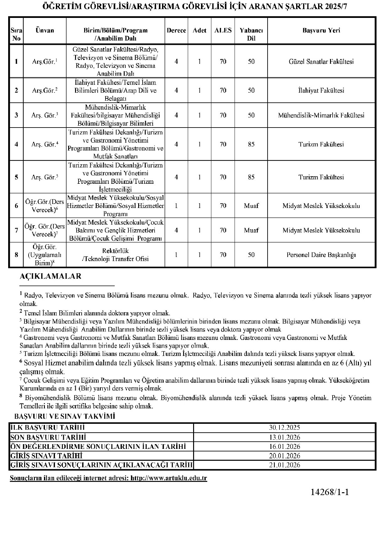 Başvuru süresi ilanın Resmi Gazete'de yayım tarihinden itibaren 15 (Onbeş) gündür. Profesör ve Doçent başvurulan Mardin Artuklu Üniversitesi Rektörlüğüne (Personel Daire Başkanlığı), doktor öğretim üyesi başvuruları ise ilgili birime şahsen yapılacaktır.