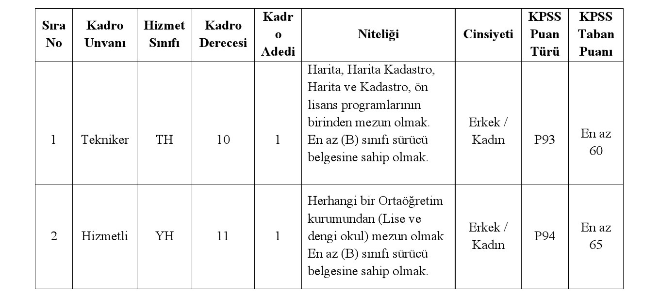 Kırıkkale ili Çerikli Belediye Başkanlığı bünyesinde, 657 sayılı Devlet Memurları Kanununa tabi olarak istihdam edilmek üzere; Mahalli İdarelere İlk Defa Atanacaklara Dair Sınav ve Atama Yönetmeliği hükümlerine göre aşağıda unvanı, sınıfı, derecesi, adedi, nitelikleri, KPSS puan türü, KPSS taban puanı ve diğer şartları taşımak kaydıyla belirtilen boş kadrolara açıktan atama yoluyla memur alınacaktır.