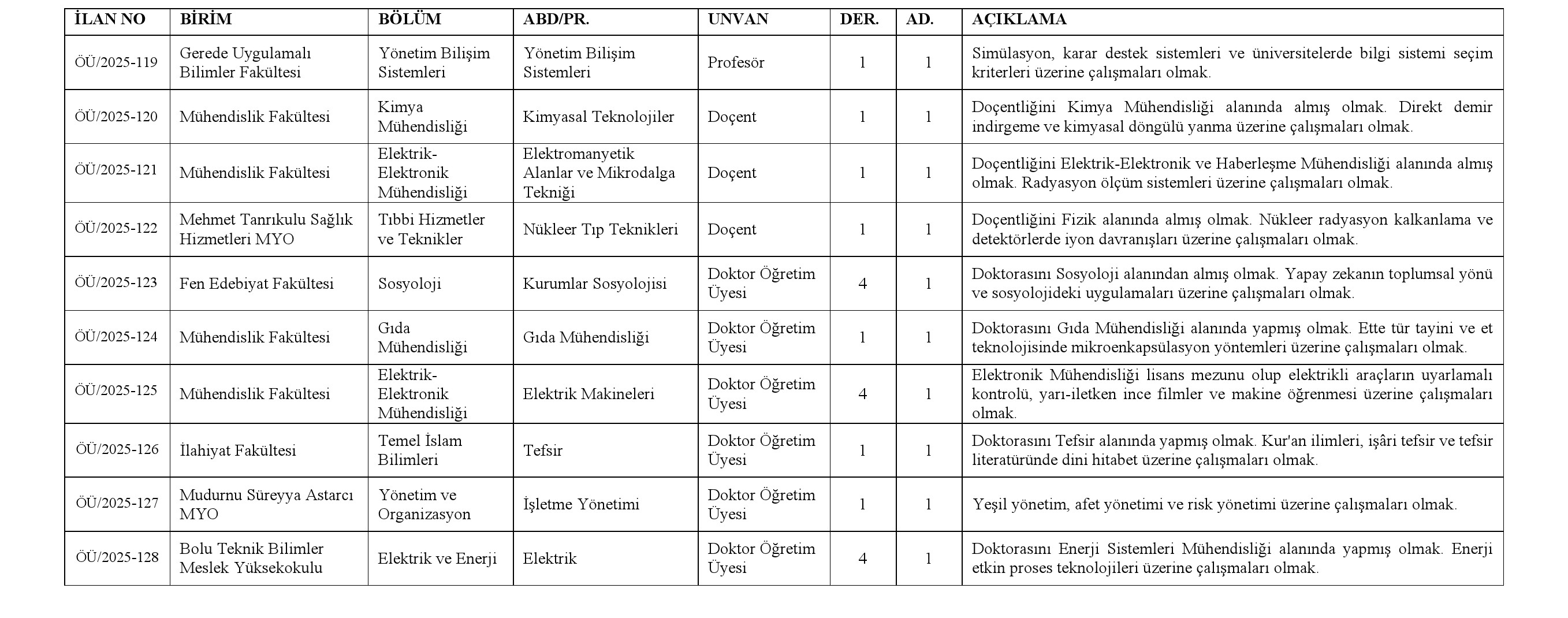 Not: 2547 sayılı Kanun'un ek 38. maddesi uyarınca belirlenen %30 kota kapsamında başvuru yapılabilecek doktor öğretim üyesi kadrosu bulunmamaktadır.