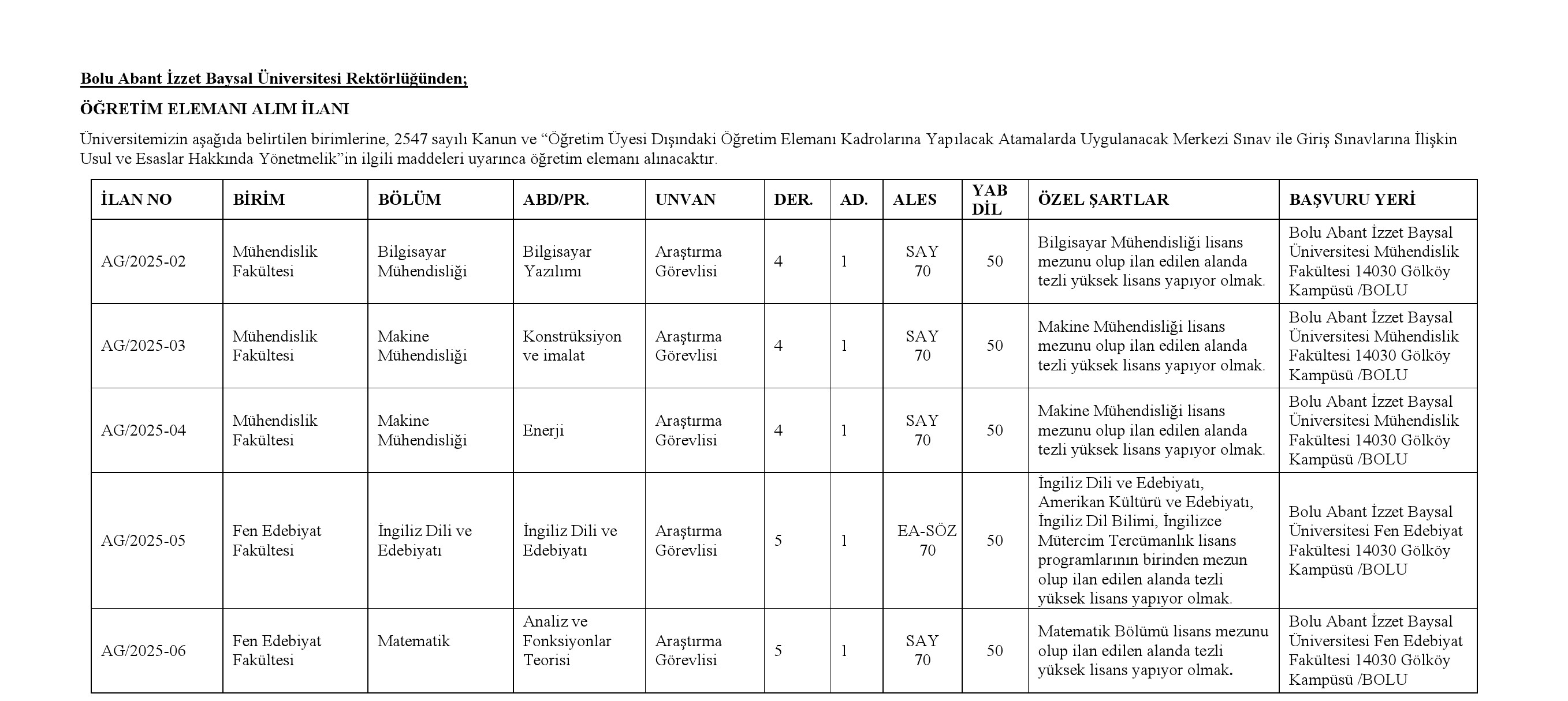 Bolu Abant İzzet Baysal Üniversitesi Öğretim Üyesi ve Elemanı Alım İlanı. Son başvuru tarihi 15 Ocak 2026