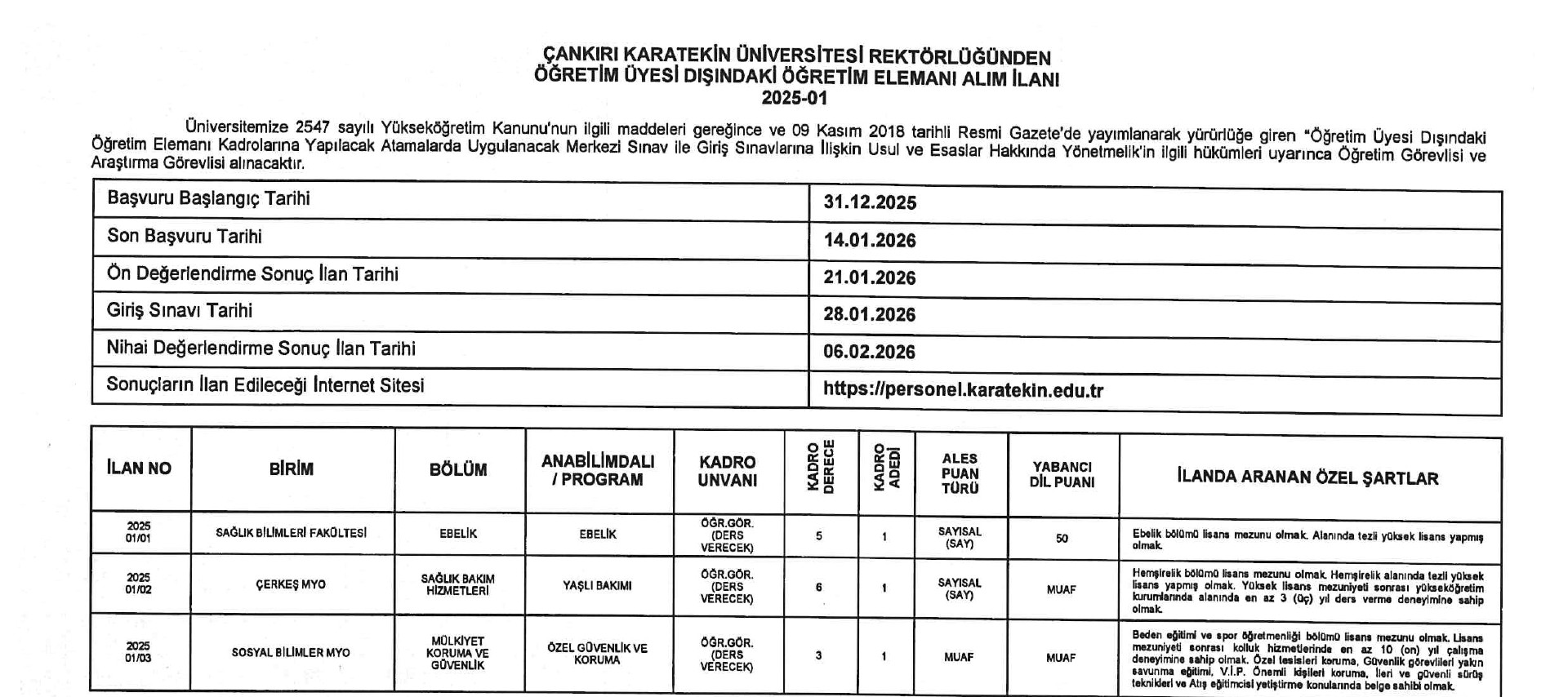 Çankırı Karatekin Üniversitesi Öğretim Üyesi ve Elemanı Alım İlanı. Son başvuru tarihi 14 Ocak 2026