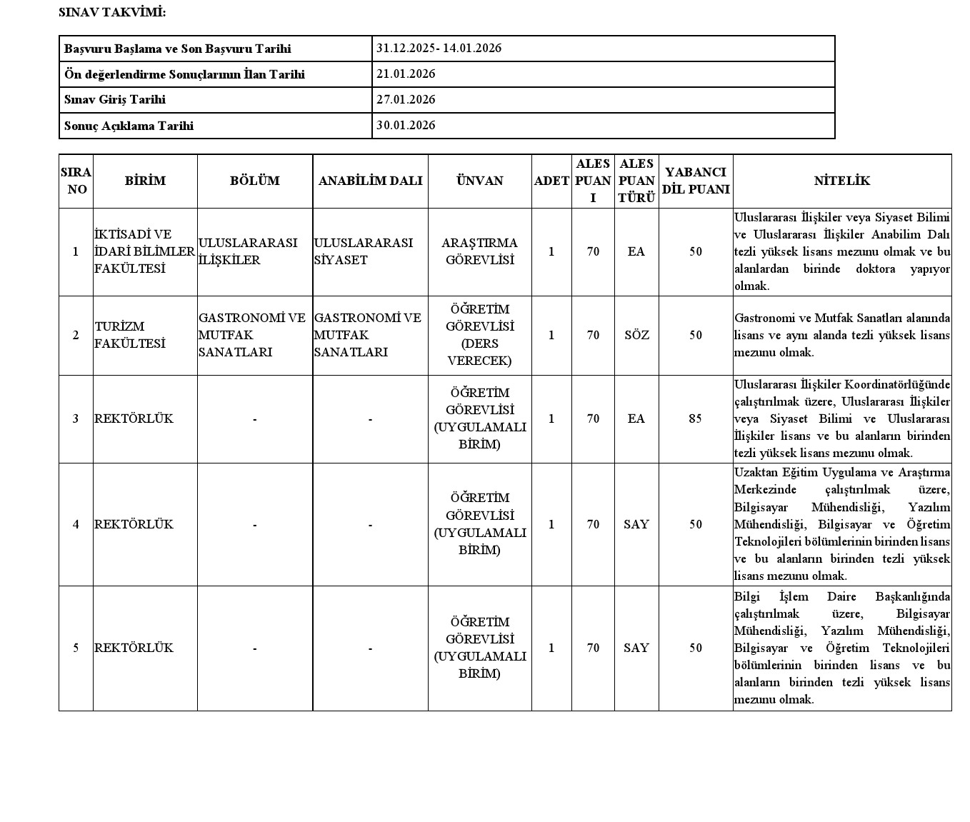 Üniversitemiz birimlerinde açık bulunan ve aşağıda bölümleri/anabilim dalları ile unvan ve koşulları belirtilen kadrolara 2547 sayılı Kanun'un ilgili maddeleri, 657 sayılı Devlet Memurları Kanunu'nun 48. maddesi, Devlet Yükseköğretim Kurumlarında Öğretim Elemanı Norm Kadrolarının Belirlenmesine ve Kullanılmasına İlişkin Yönetmelik, Öğretim Üyesi Dışındaki Öğretim Elemanı Kadrolarına Yapılacak Atamalarda Uygulanacak Merkezi Sınav ile Giriş Sınavlarına İlişkin Usul ve Esaslar Hakkında Yönetmelik" ve "Öncelikli Alanlardaki Araştırma Görevlisi Kadrolarına Atananların Lisansüstü Eğitimleri İle Diğer Hususlara İlişkin Usul ve Esaslar"a göre öğretim elemanı alınacaktır.