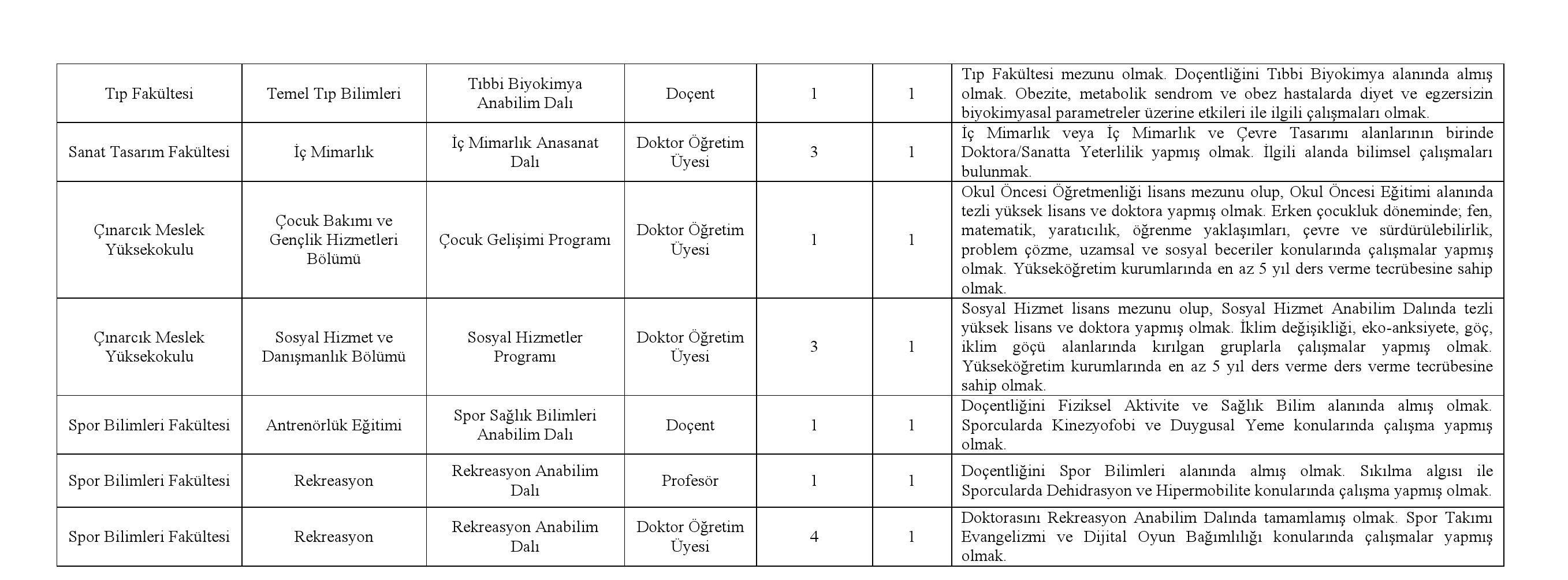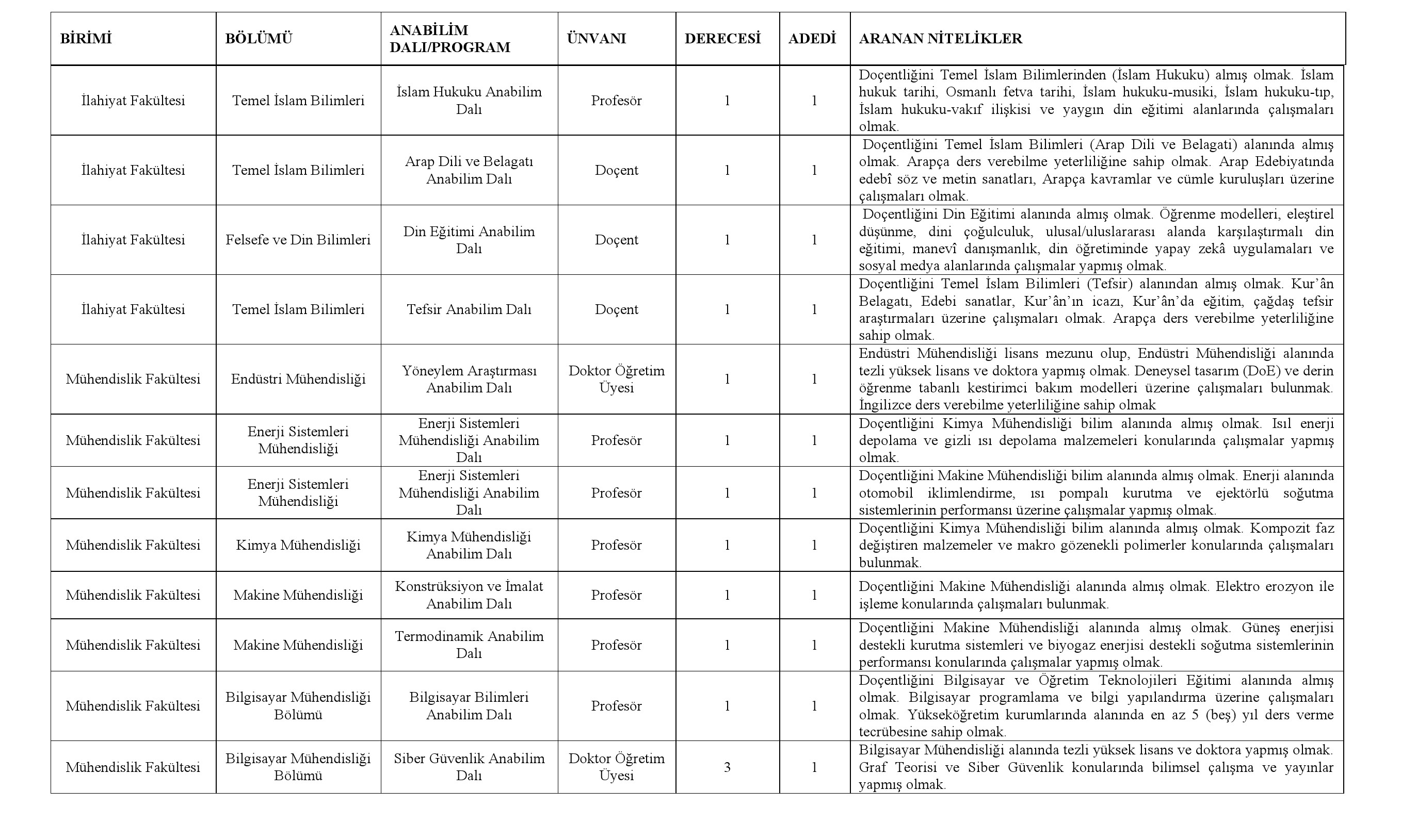 Üniversitemizin aşağıda belirtilen kadrolarına 2547 sayılı Yükseköğretim Kanunu, Öğretim Üyeliğine Yükseltilme ve Atanma Yönetmeliği ve Üniversitemiz Senatosu'nca belirlenerek Yükseköğretim Kurulu Başkanlığı tarafından onaylanan Akademik Atama ve Yükseltme Kriterleri uyarınca öğretim üyeleri alınacaktır.