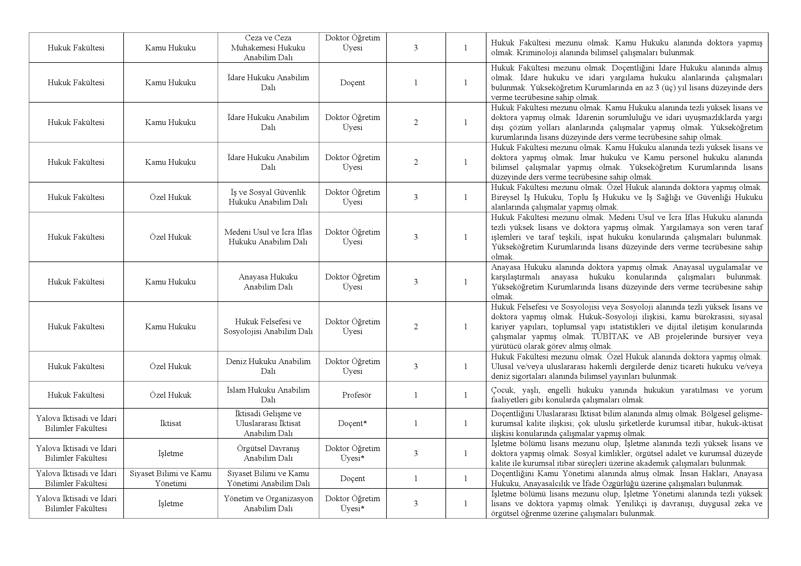 6- Kadrolara müracaat eden adayların Yalova Üniversitesi Senatosu tarafından kararlaştırılan ve Yükseköğretim Kurulu Başkanlığınca kabul edilen "Öğretim Üyeliğine Yükseltilme ve Atanma Kriterlerinde" belirtilen şartları taşımaları gerekmektedir. Bu Kriterlere uymayan adayların başvuruları kabul edilmeyecektir. Adaylar söz konusu kriterler ekinde yer alan formları doldurup başvuru formuyla birlikte teslim etmeleri gerekmektedir.