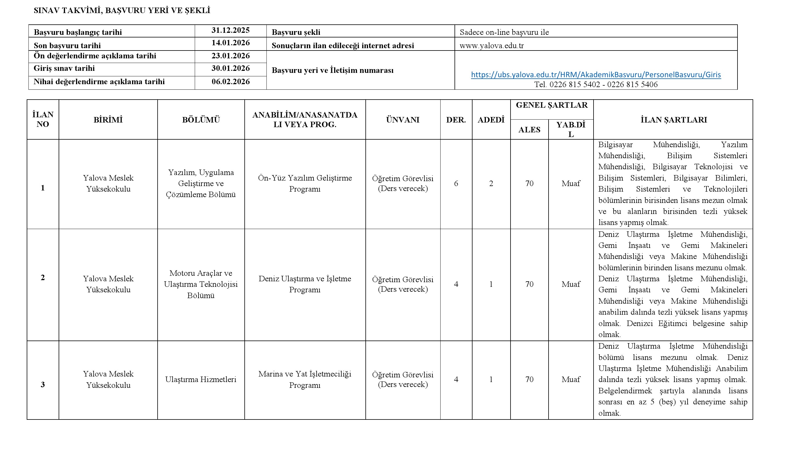 Yalova Üniversitesi Öğretim Üyesi ve Elemanı Alım İlanı. Son başvuru tarihi 14 Ocak 2026