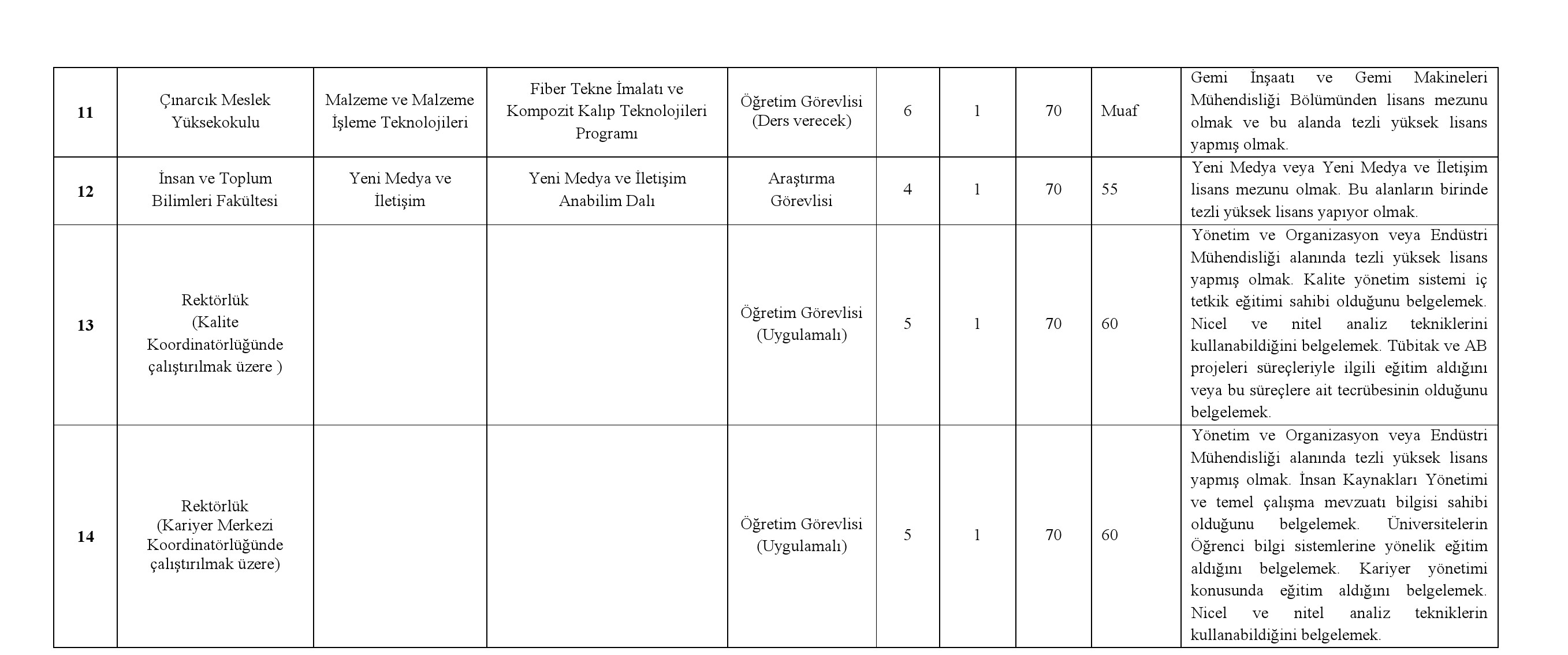 13-*İşaretli kadrolara Yükseköğretim Kurumlarında Yabancı Dil Öğretimi ve Yabancı Dille Öğretim Yapılmasında Uyulacak Esaslara İlişkin Yönetmelik uyarınca İngilizce Ders verme yeterliliğine sahip olduğunu belgelendirenler başvurabilir.
