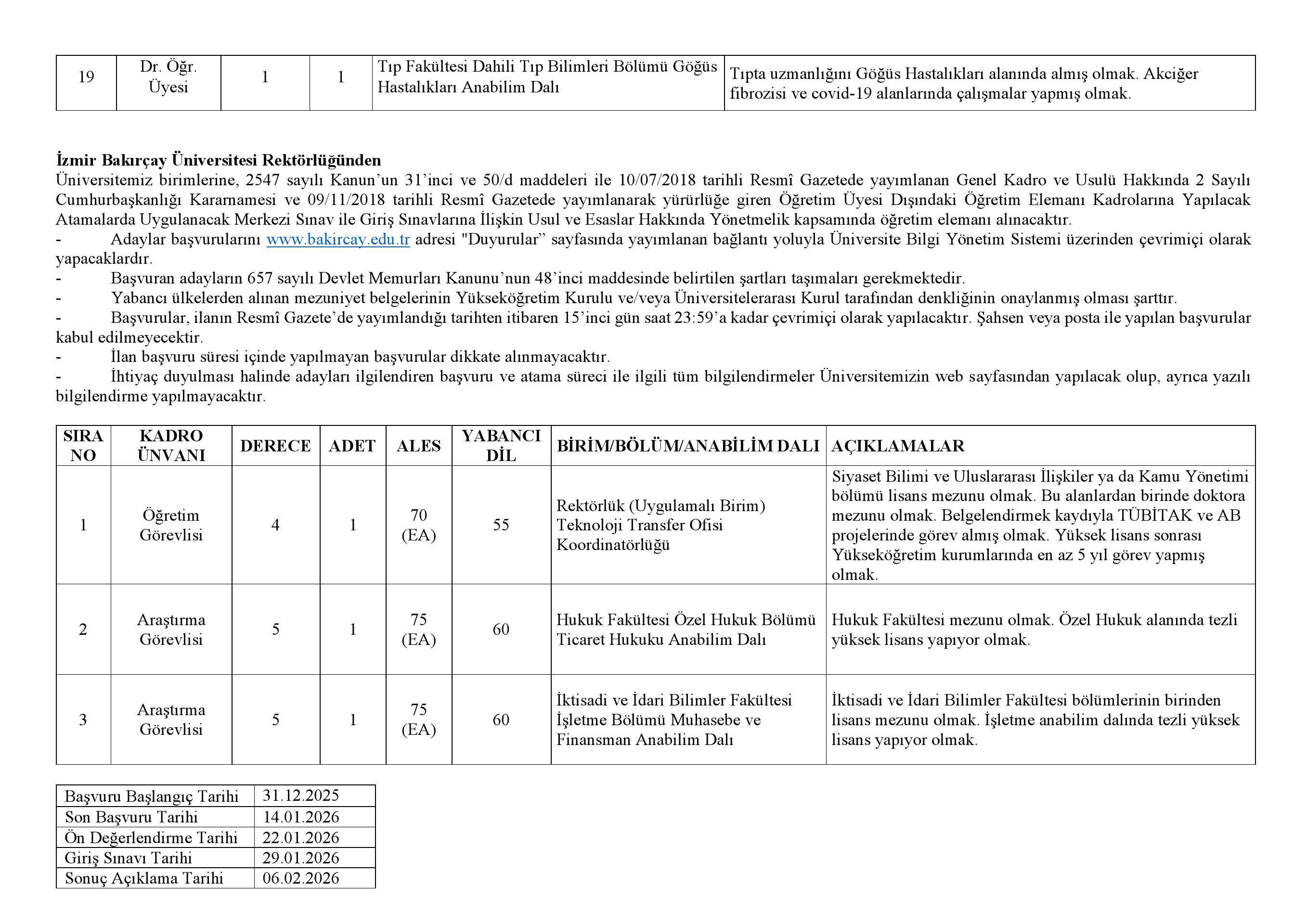 İzmir Bakırçay Üniversitesi Öğretim Üyesi ve Elemanı Alım İlanı. Son başvuru tarihi 14 Ocak 2026