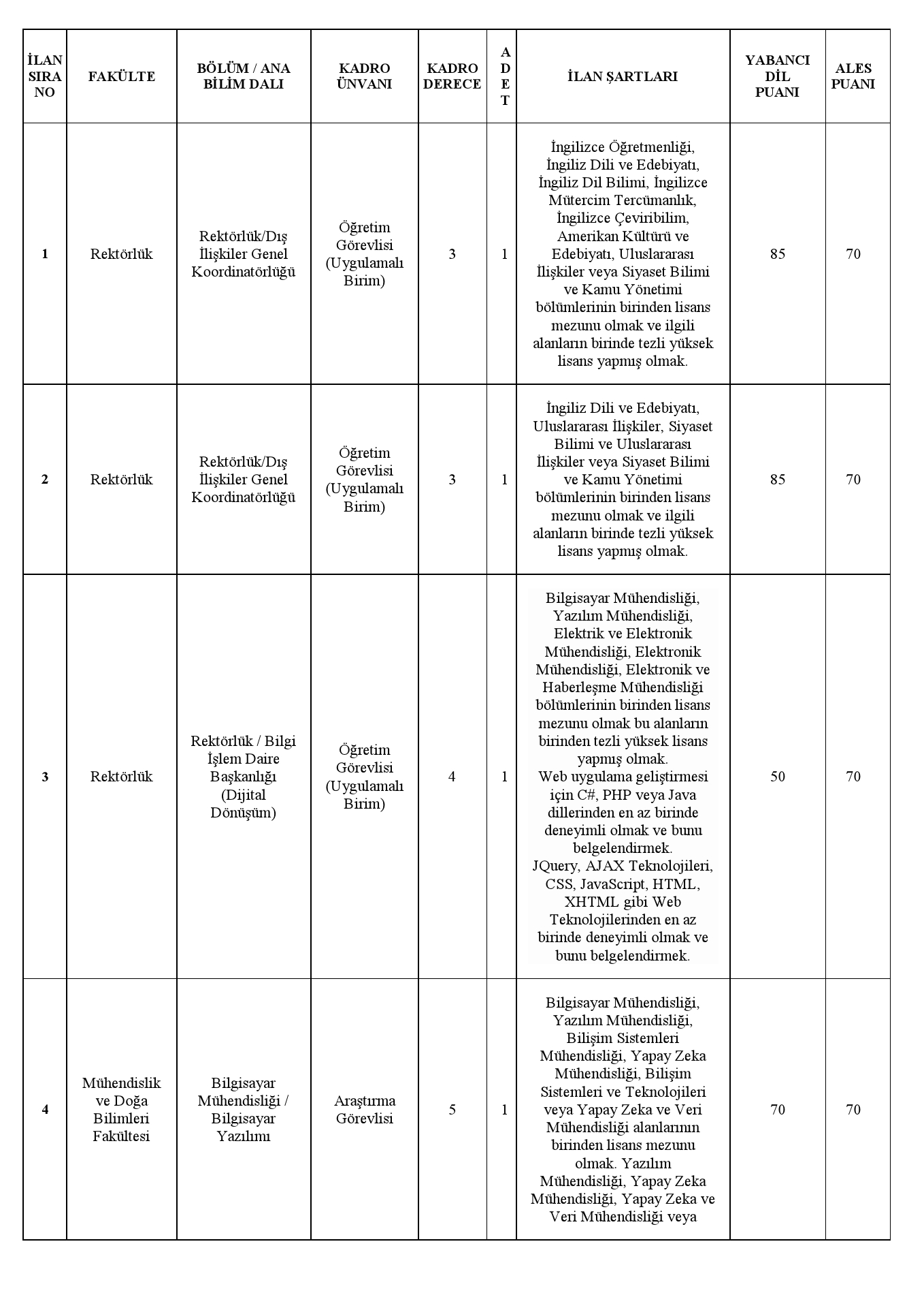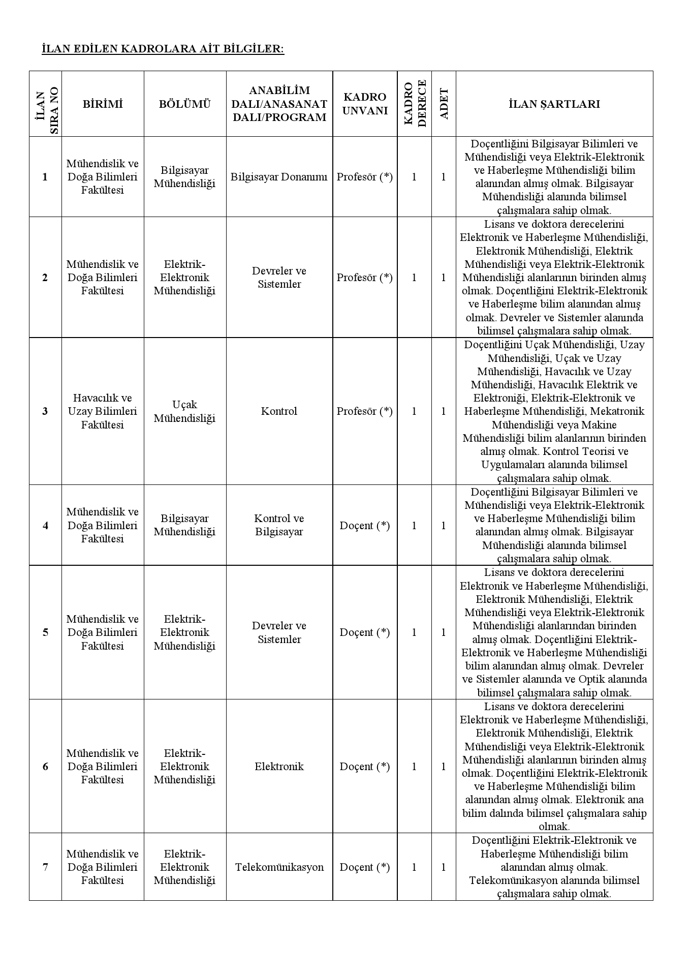 İLAN EDİLEN KADROLARA AİT BİLGİLER: