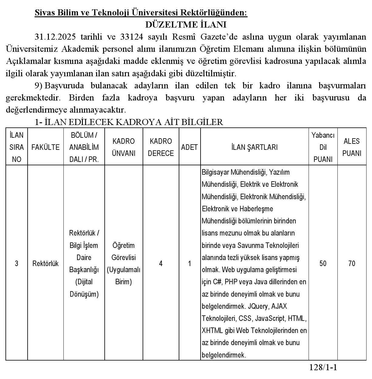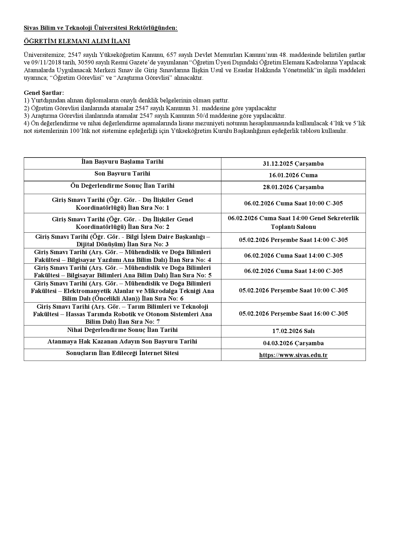 Sivas Bilim ve Teknoloji Üniversitesi Rektörlüğünden:
