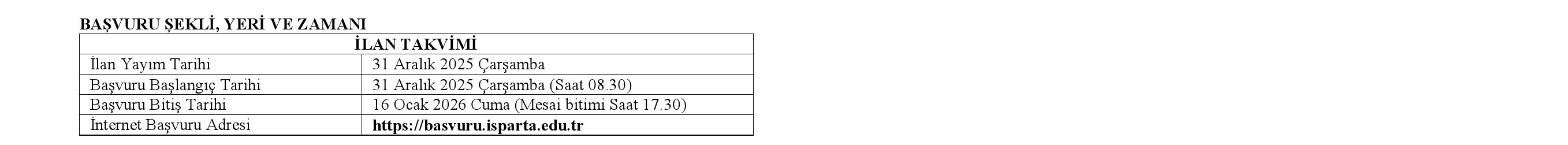 . Adaylar başvurularını, ilan takviminde belirtilen başvuru başlangıç tarihinden itibaren başvuru bitiş tarihinin mesai bitimi olan 17.30'a kadar Üniversitemiz https://basvuru.isparta.edu.trweb sayfasından çevrimiçi (online) şekilde yapacaklardır. Adayların çevrimiçi (online) başvuruyu tamamladıktan sonra sistem tarafından oluşturulan Başvuru Formu çıktı alınıp imzalandıktan sonra, Profesör ve Doçent adayları 1 adet CD/DVD/USB, Doktor Öğretim Üyesi adayları 1 adet CD/DVD/USB'yi aşağıdaki tabloda belirtilen birim adresine başvuru süresi içerisinde şahsen teslim etmeleri gerekmektedir. Başvuru formu ve eklerini aşağıdaki tabloda belirtilen birim adresine şahsen teslim etmeyenlerin müracaatları kabul edilmeyecektir.