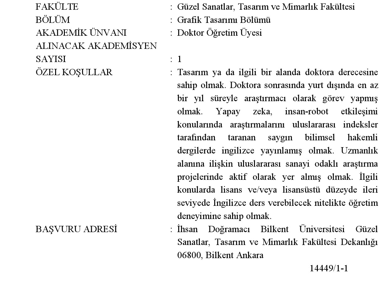 2547 sayılı Yüksek Öğretim Kanununun 23. maddesi, 12 Haziran 2018 tarih ve 30449 sayılı Resmi Gazete'de yayınlanmış olan "Öğretim Üyeliğine Yükseltilme ve Atanma Yönetmeliği"nin Doktor Öğretim Üyesi Kadrolarına Atanma koşullarını düzenleyen 4-7. maddeleri hükümlerinde aranan koşulları yerine getirmiş olmak kaydı ile İhsan Doğramacı Bilkent Üniversitesi Güzel Sanatlar, Tasarım ve Mimarlık Fakültesi, Grafik Tasarımı Bölümü'ne tam gün statüde çalışacak öğretim üyesi alınacaktır.