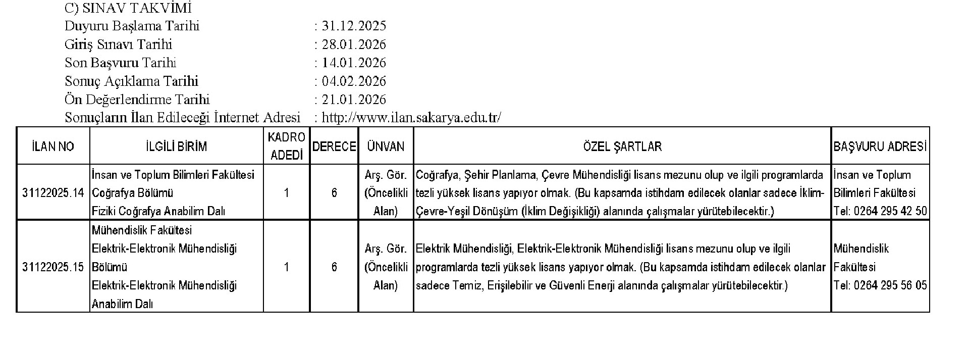Adaylar ilan edilen kadrolardan ancak birine başvuru yapabilir, aynı ilan dönemi içinde birden fazla kadroya başvurusu bulunduğu tespit edilen adayların tüm başvuruları geçersiz sayılacaktır. Başvurular şahsen veya posta ile yapılacak olup süresi içinde yapılmayan ya da eksik belgeli yapılan başvurular değerlendirmeye alınmayacaktır. Postadaki gecikmelerden Üniversitemiz sorumlu değildir. İstenilen belgelerde gerçeğe aykın beyanda bulunduğu tespit edilenlerin sınavı geçersiz sayılacak ve atamaları yapılmayacakhr. Bunların atamaları yapılmış olsa dahi iptal edilecek ve hiçbir hak talep edemeyeceklerdir. Bu kişiler hakkında yasal işlem yapılacaktır. Üniversitemiz sınav takviminde zorunlu hallerde değişiklik yapma hakkım saldı tutar ve ilamn her aşamasım iptal edebilir, http://www.ilan.sakarya.edu.tr/ adresinden yapılan tüm duyurular tebligat mahiyetindedir. Kişilere aynca yazılı tebligat yapılmayacakhr.