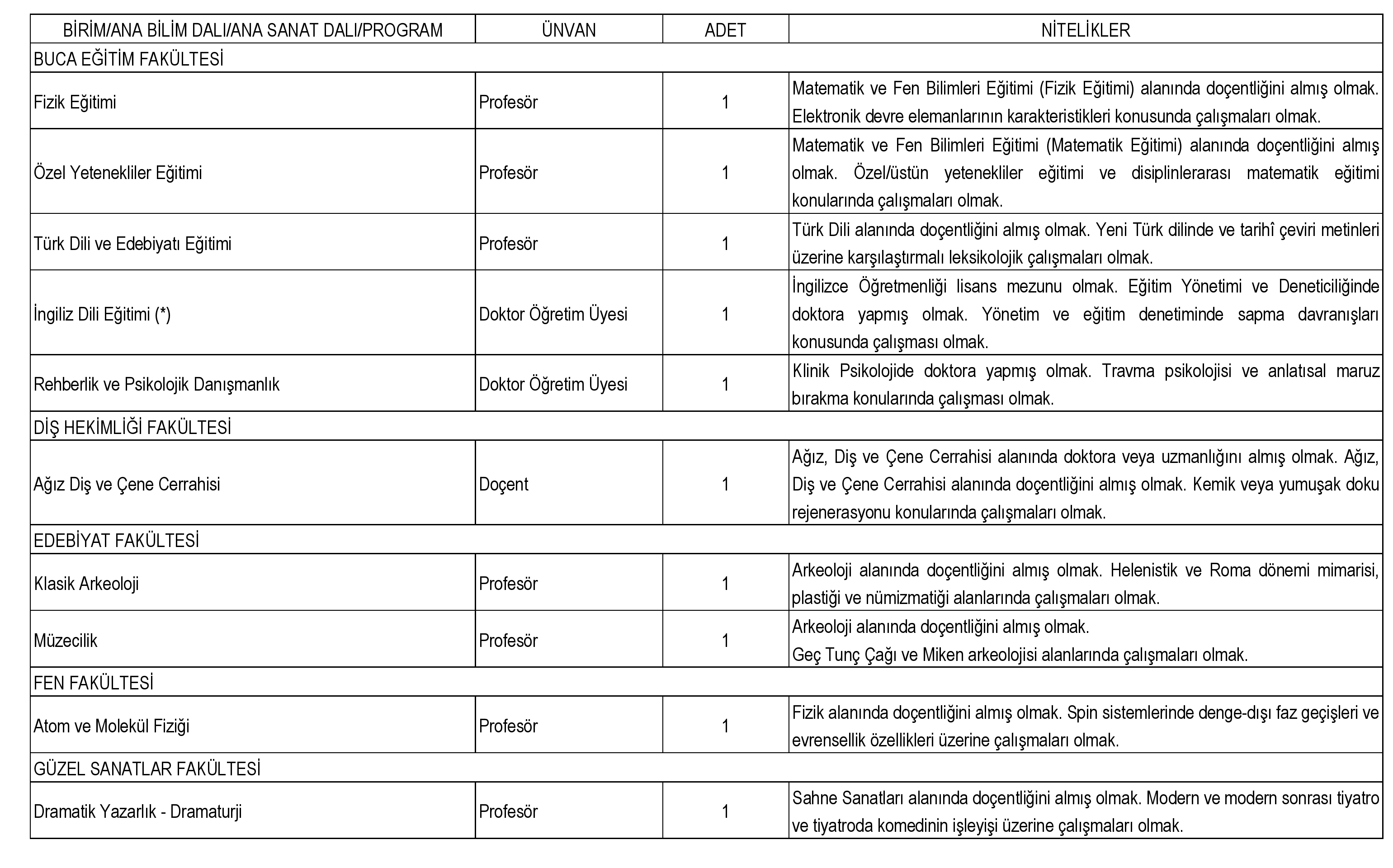 Adayların; son altı ay içinde çekilmiş bir adet fotoğraf, TC kimlik kartı, e-Devlet üzerinden alınan lisans, yüksek lisans, doktora, mezun belgeleri ile doçentlik belgesi, uzmanlık belgesi, yabancı dil sınav sonuç belgesi, hizmet belgesi, özgeçmiş ve yayın listesi ve bilimsel eserlerinden oluşan dosyalarını, https://deabs.deu.edu.tr üzerinden yüklemeleri gerekmektedir.