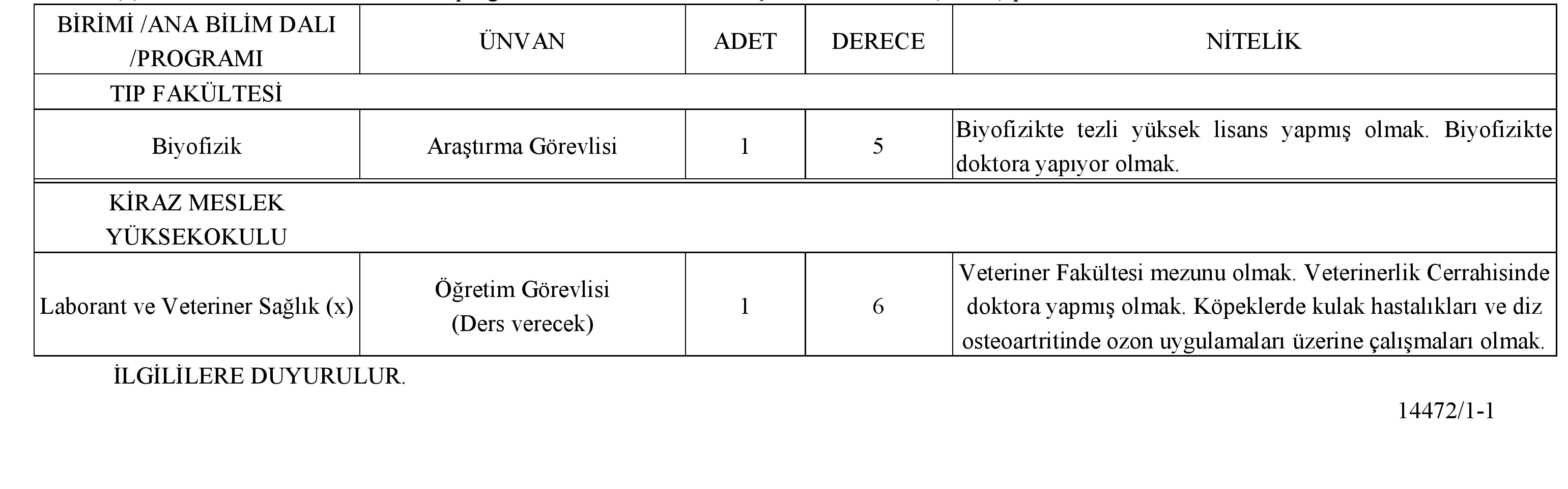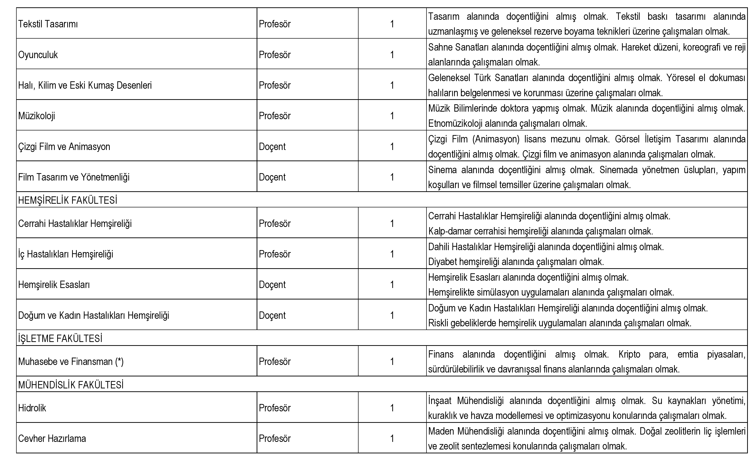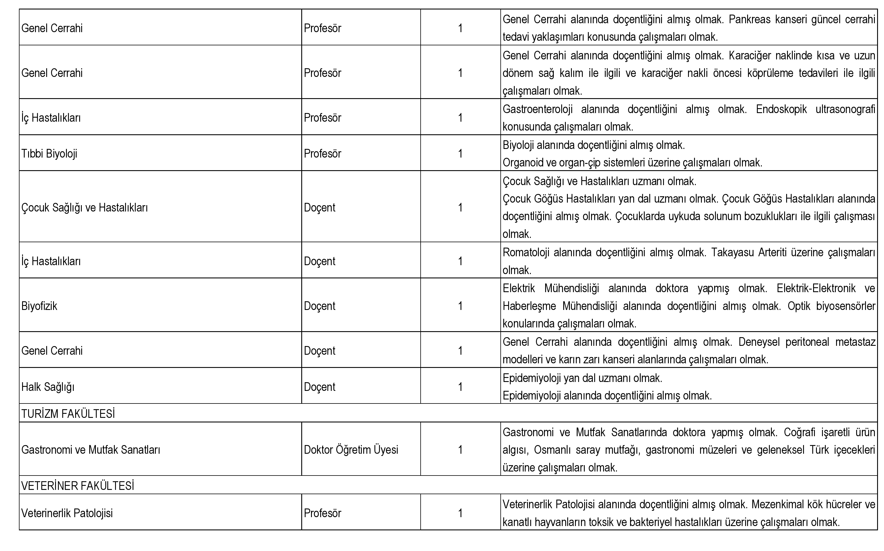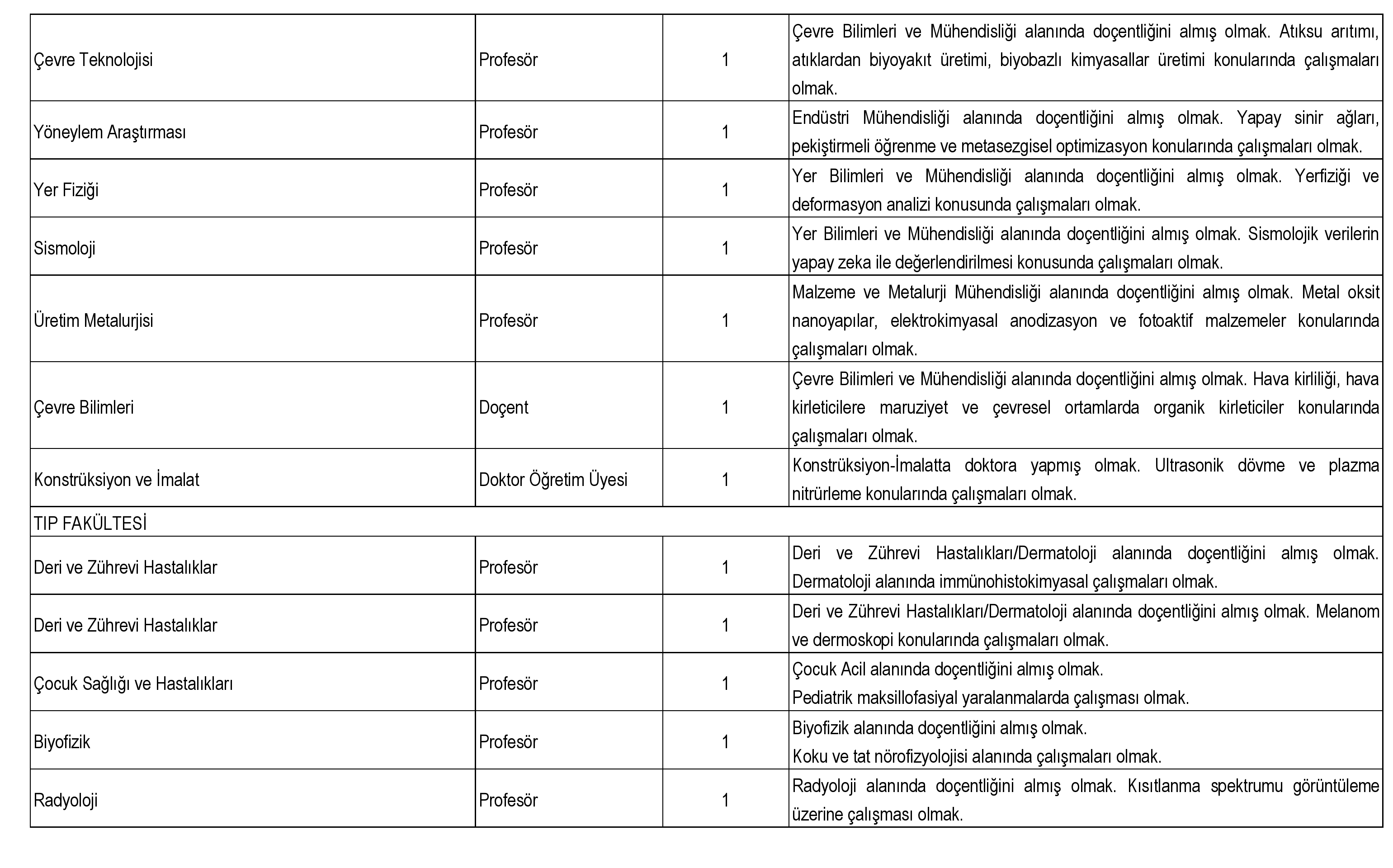 Üniversitemiz birimlerine 2547 sayılı Yükseköğretim Kanununa göre aşağıda belirtilen ana bilim dallarına Öğretim Üyesi alınacaktır.