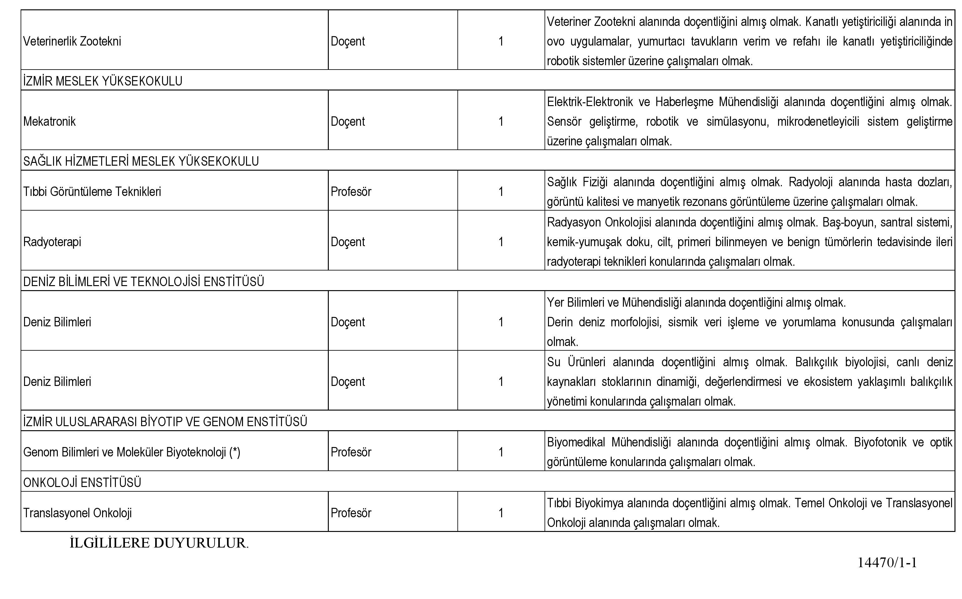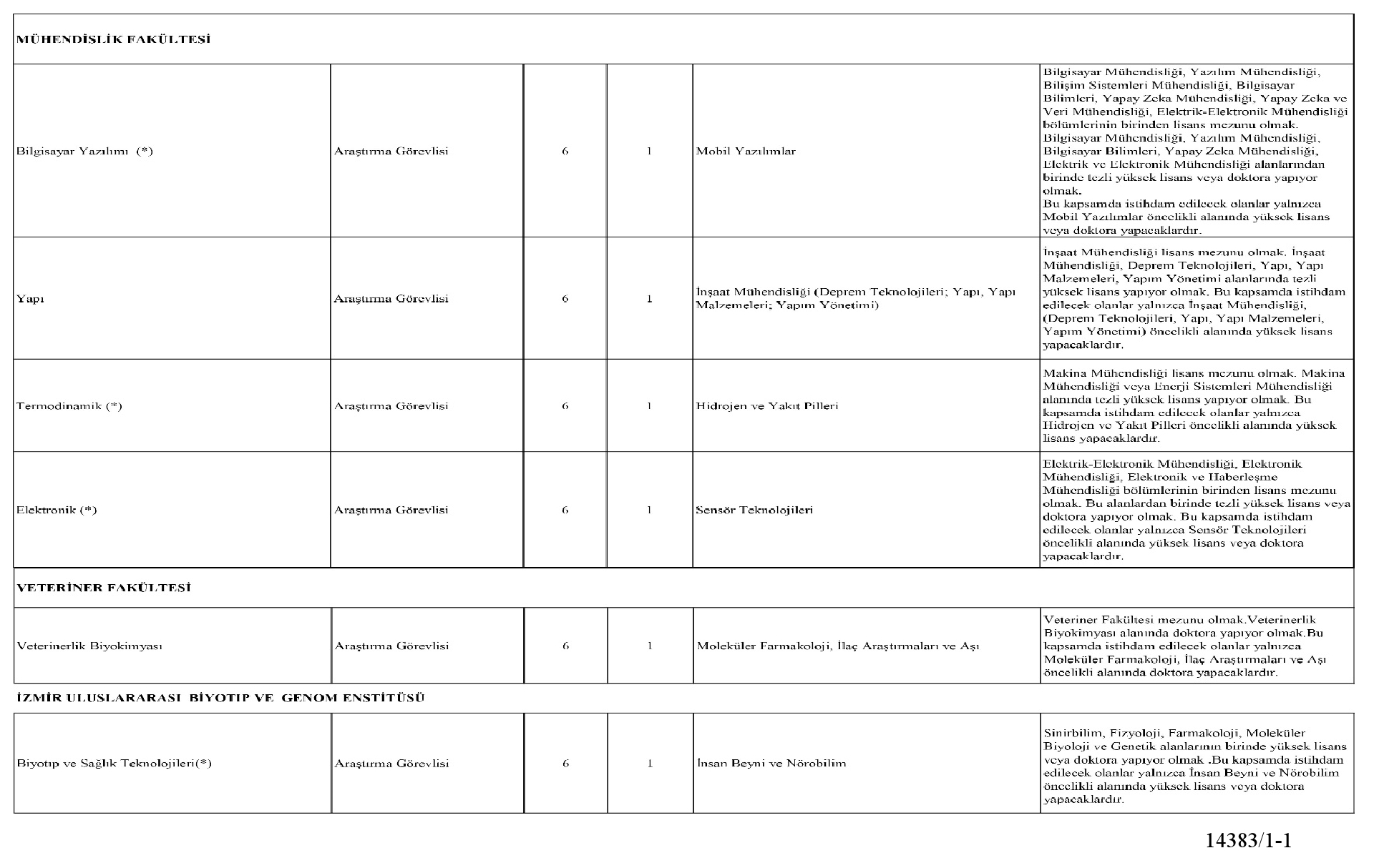 NOT: (*) bulunan ana bilim dalında İngilizceden Yükseköğretim Kurumlarında Yabancı Dil Öğretimi ve Yabancı Dille Öğretim Yapılmasında Uyulacak Esaslara İlişkin Yönetmelik'te belirtilen şartlara sahip olmak.