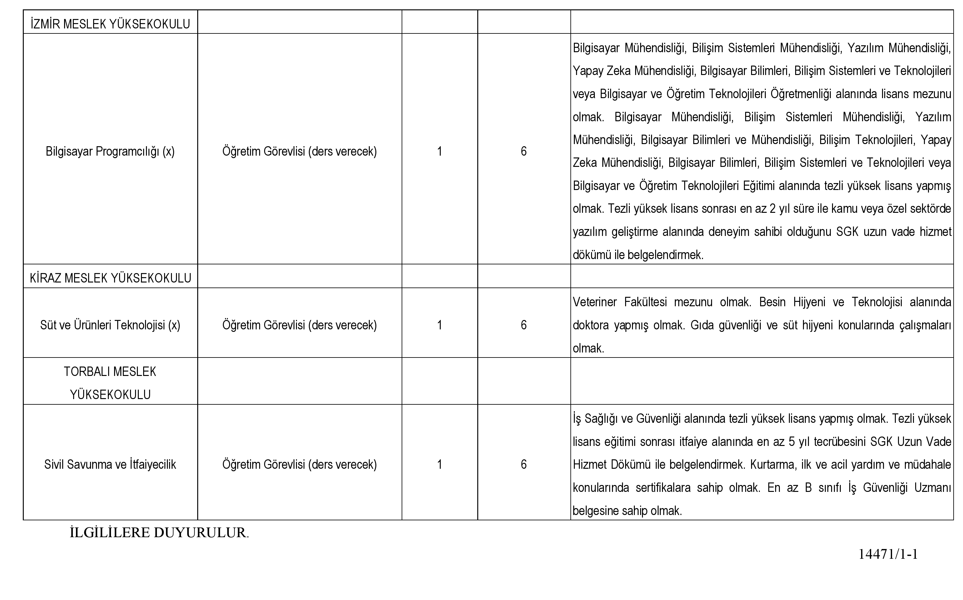 Öğretim görevlisi kadrosuna başvuracak adaylarda en az tezli yüksek lisans derecesine sahip olmak veya lisans ve yüksek lisans derecesini birlikte veren programlardan mezun olmak şartı aranır.