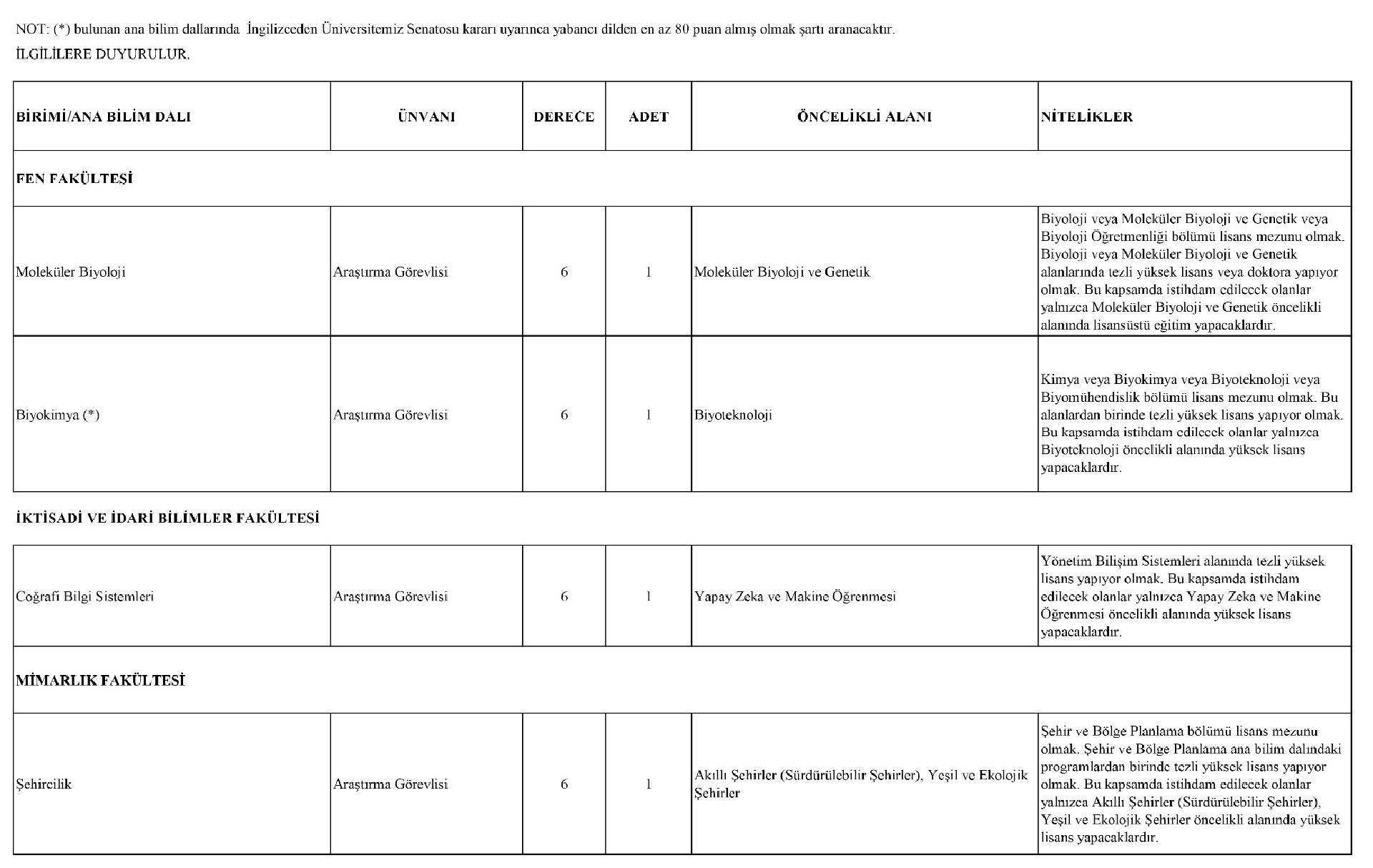 NOT: (*) bulunan ana bilim dallarında İngilizceden Üniversitemiz Senatosu kararı uyarınca yabancı dilden en az 80 puan alınış olmak şartı aranacaktır.