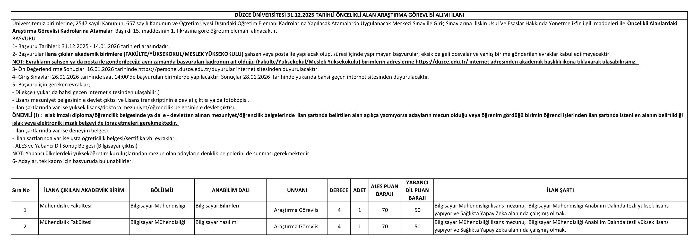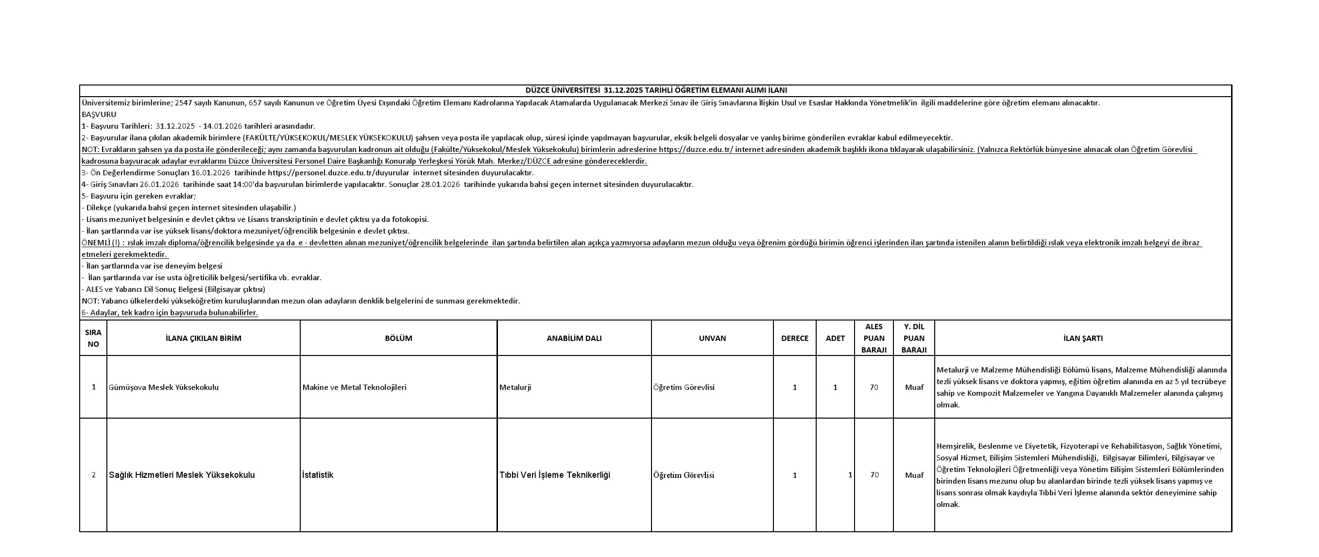 Düzce Üniversitesi Öğretim Üyesi ve Elemanı Alım İlanı. Son başvuru tarihi 15 Ocak 2026