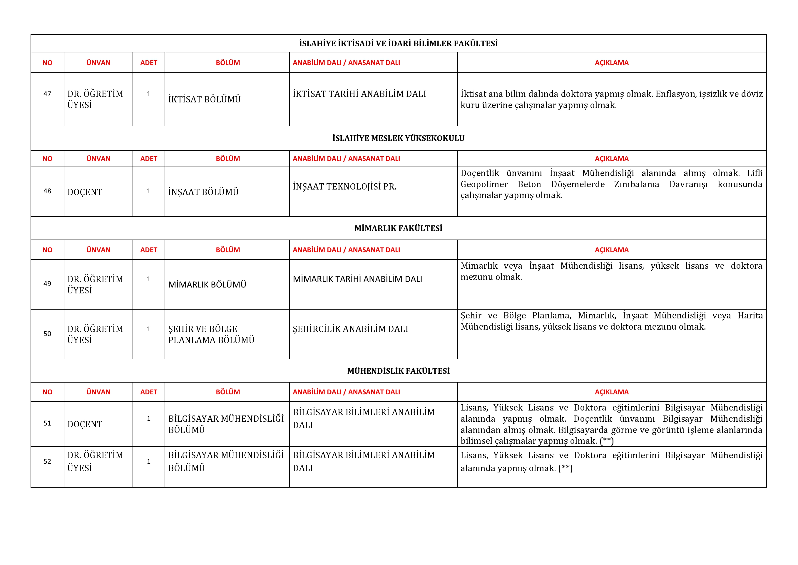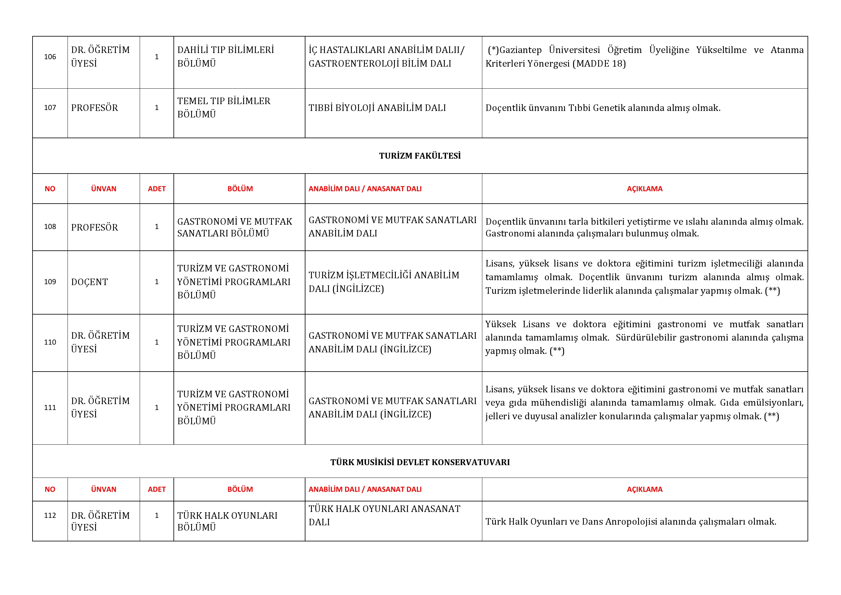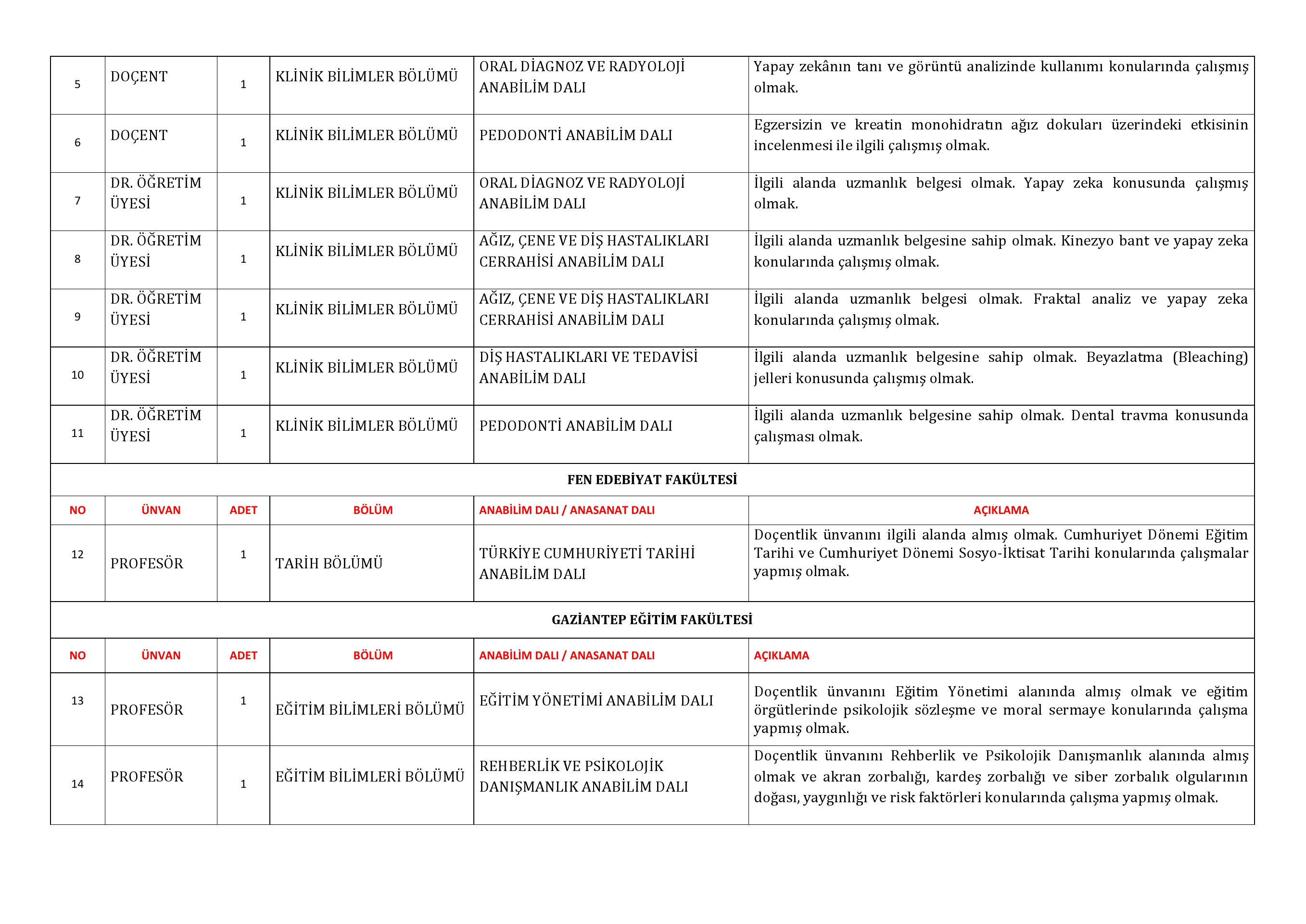 Üniversitemizin aşağıda belirtilen birimlerine, 2547 sayılı Kanun ile Öğretim Üyeliğine Yükseltilme ve Atanma Yönetmeliğinin ilgili maddeleri uyarınca öğretim üyesi alınacaktır.Tüm başvurularilanın Resmi Gazete 'de yayımlandığı tarihten itibaren15 gün içerisindehttps://gaunay.gantep.edu.tr/adresi üzerinden online olarak alınacak. "online başvuru" tamamlandı belgesi, 2 adet vesikalık fotoğraf ve 1 (bir) adet taşınabilir bellek ile şahsen veya vekaletname verilmiş vekil aracılığıile yapılan başvurular kabul edilecektir.