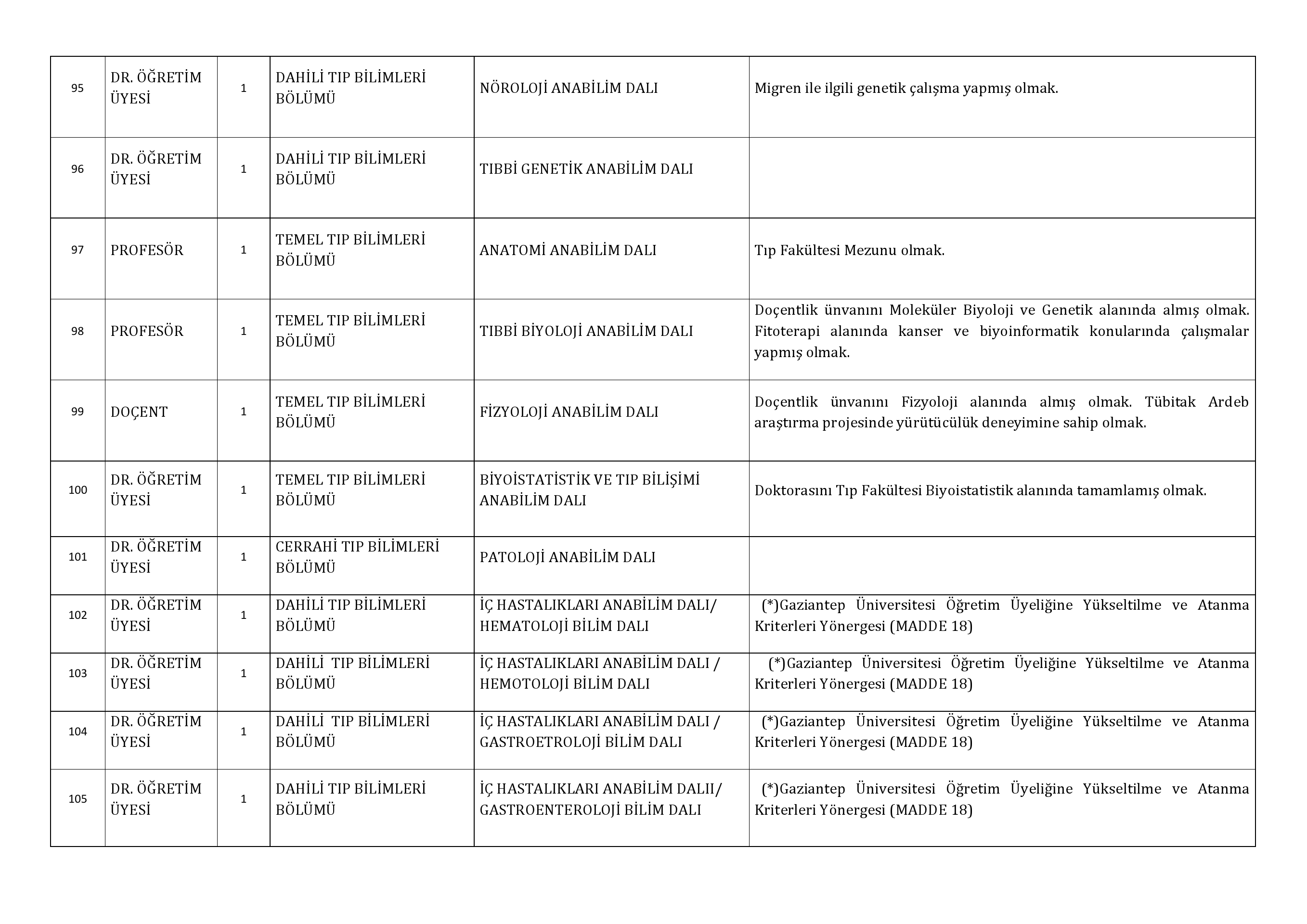 (*)MADDE18 (2) İlgili kadro ilanında belirtilmek şartıyla; Tıp ve Diş Hekimliği Fakültelerinde eğitim-öğretimin sürdürülebilmesi için Yükseköğretim Kurulunca belirlenen ana bilim dalı bazında gerekli asgari öğretim üyesi sayısını karşılamak üzere öğretim üyesi eksiği olan anabilim dallarında Gaziantep Üniversitesi Öğretim Üyeliğine Yükseltilme ve Atanma Kriterleri Yönergesinde belirtilen puan ve diğer şartları sağlayan aday olmaması durumunda, 2547 sayılı Kanunun 23, 24 ve 26. maddelerindeki ve Öğretim Üyeliğine Yükseltilme ve Atanma Yönetmeliğindeki asgari koşulları sağlayanların jüri değerlendirmeleri geldikten sonra, Üniversite Yönetim Kurulu kararı ve Rektörün uygun görmesiyle atama işlemleri yapılabilir.