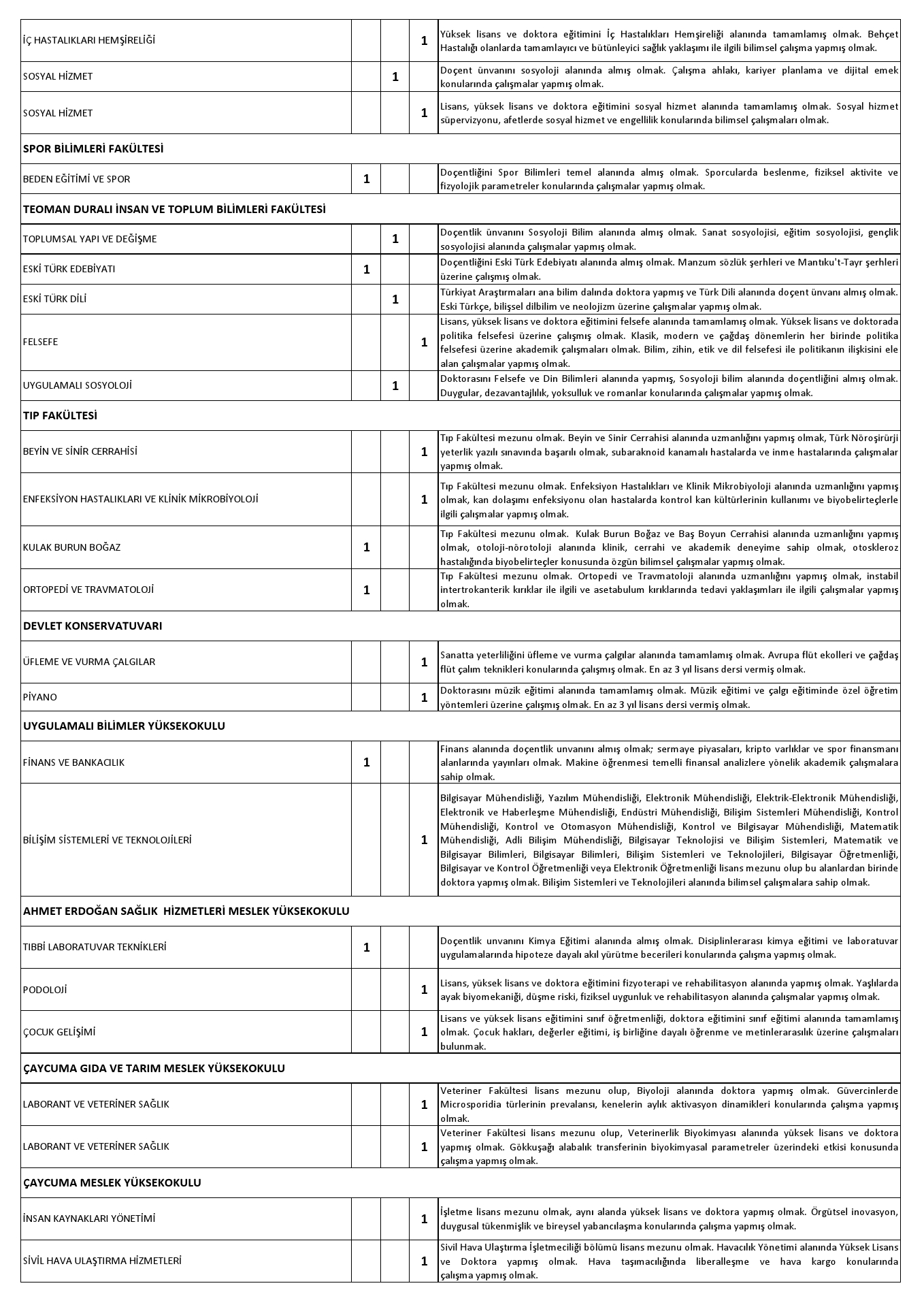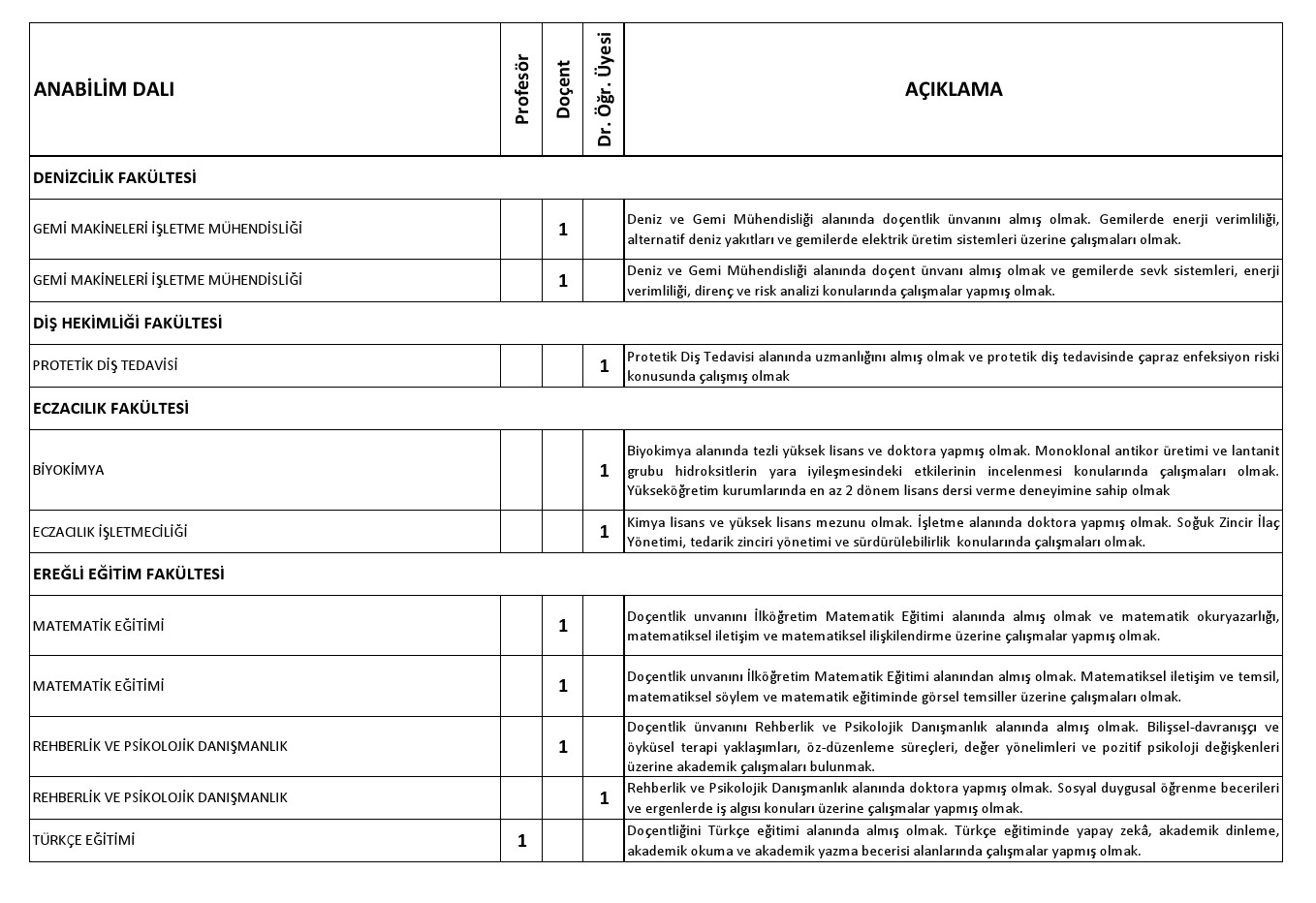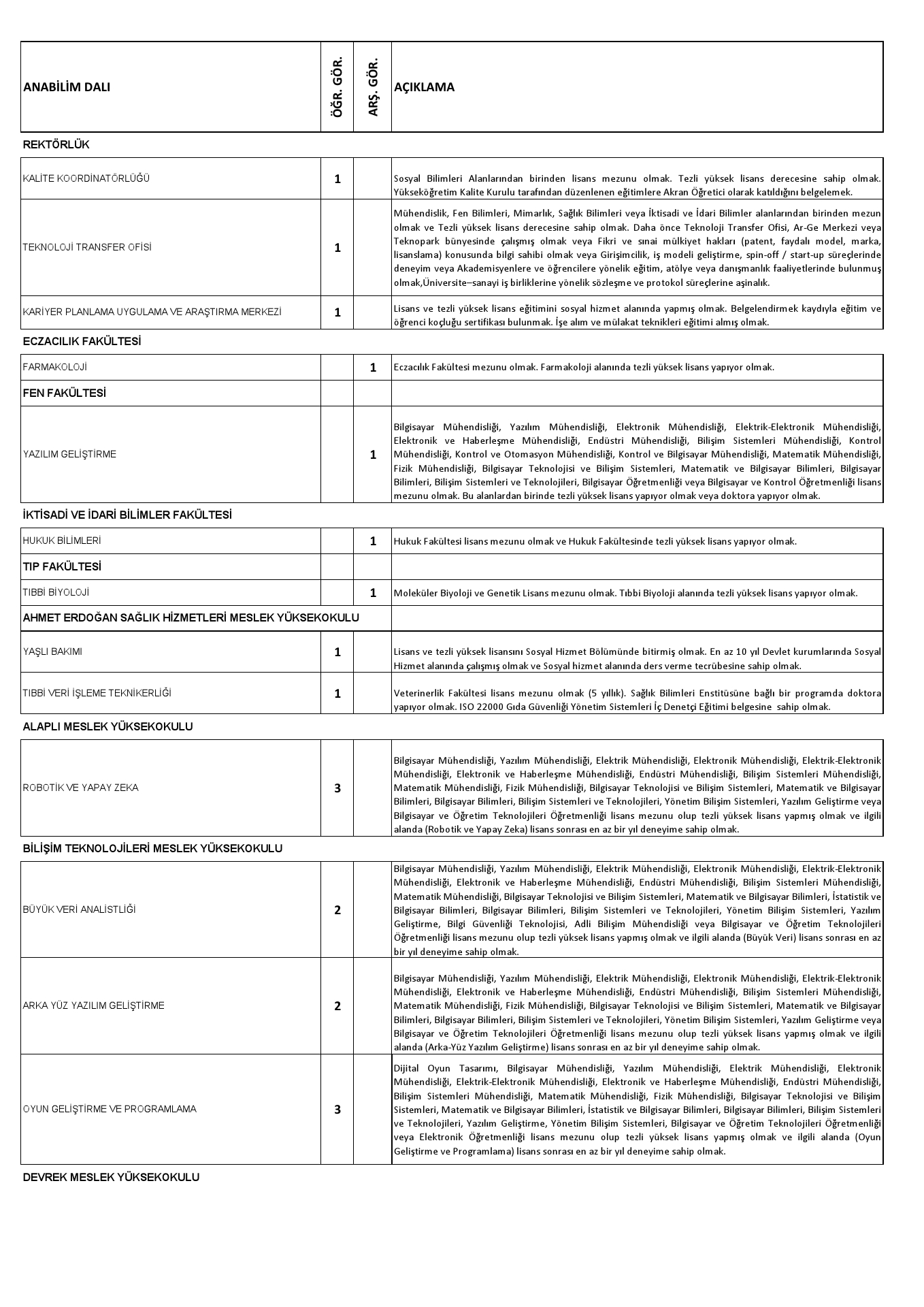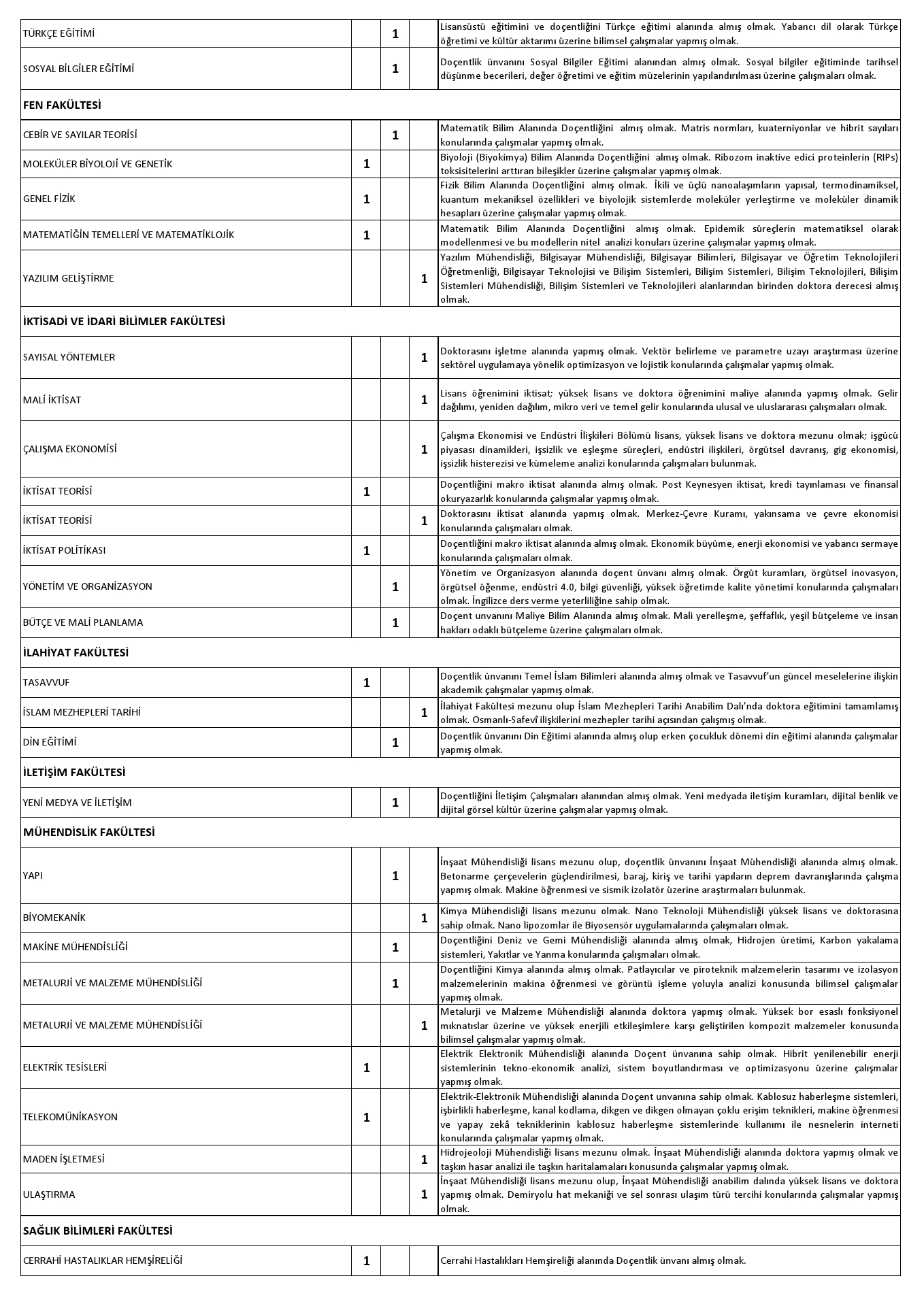 Aşağıda Anabilim Dalı itibariyle ünvan ve atanma şartları belirtilen, Üniversitemiz Fakülte, Yüksekokul ve Meslek Yüksekokullarında açık bulunan kadrolara 2547 Sayılı Yükseköğretim Kanunu'nun ilgili maddelerine göre öğretim üyesi alınacaktır.