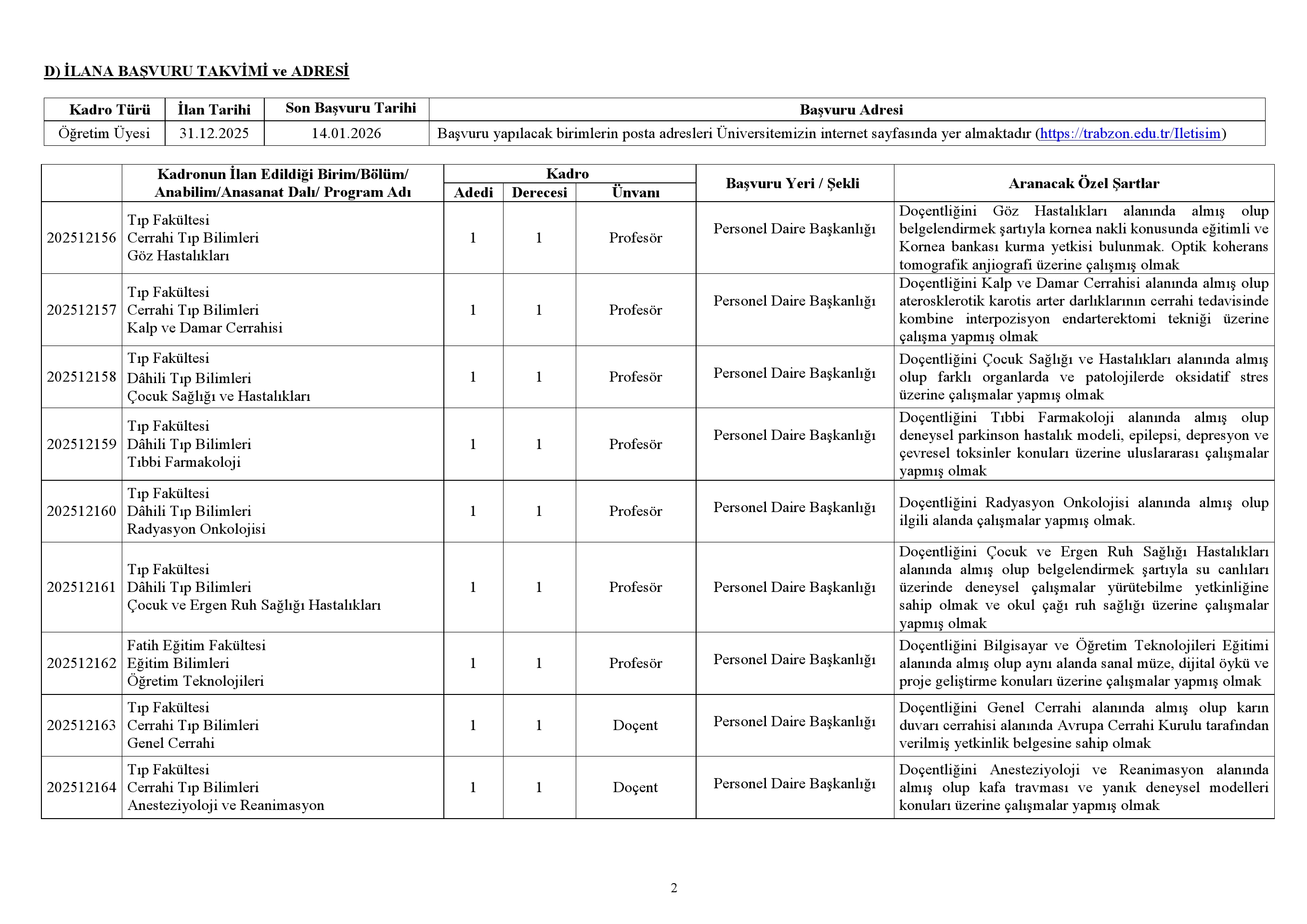 9) Başvuru süresi 14.01.2026 tarihi mesai saati sonunda (Saat 17.00'de) biter. Süresi içinde ulaşmayan başvurular ile eksik belgeli başvurular geçersiz olacaktır. Başvuru yapılacak birimin posta adresi Üniversitemizin internet sayfasında yer almaktadır (https://trabzon.edu.tr/Iletisim). Eksik belgeli başvurulardan veya postada yaşanacak gecikmelerden Üniversitemiz sorumlu değildir.