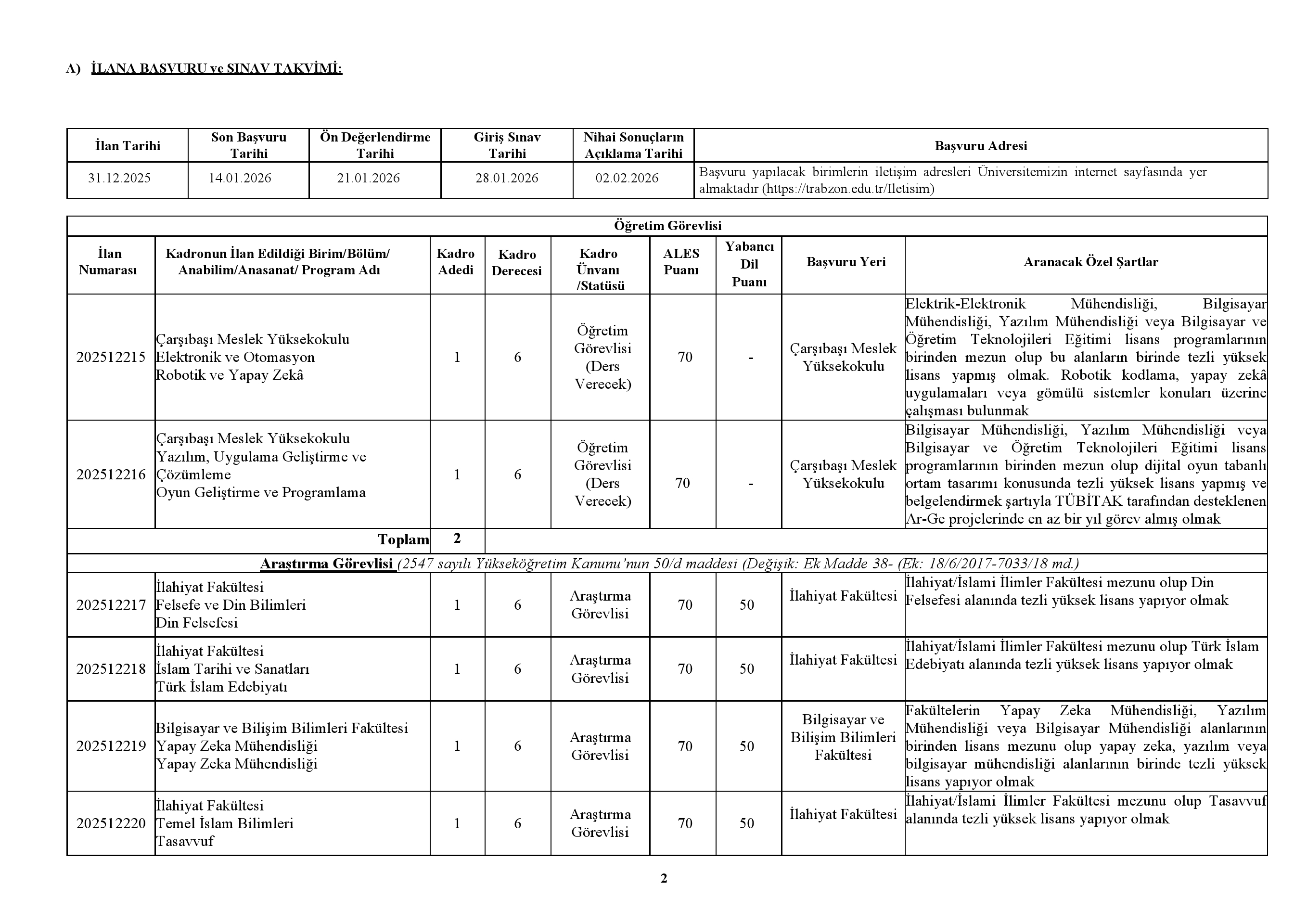 Trabzon Üniversitesi Öğretim Üyesi ve Elemanı Alım İlanı. Son başvuru tarihi 14 Ocak 2026