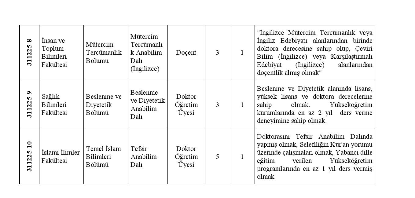 1- Üniversitemiz Akademik Birimlerine, 2547 sayılı Yükseköğretim Kanunu'nun 5772 sayılı Kanunla değişik 23. ve 24. maddelerinde belirtilen şartlar ve "Öğretim Üyeliğine Yükseltilme ve Atanma Yönetmeliği'nin ilgili maddeleri ile Üniversitemiz "Akademik Yükseltilme ve Atama Esasları Yönergesi" hükümleri uyarınca öğretim üyesi alınacaktır.