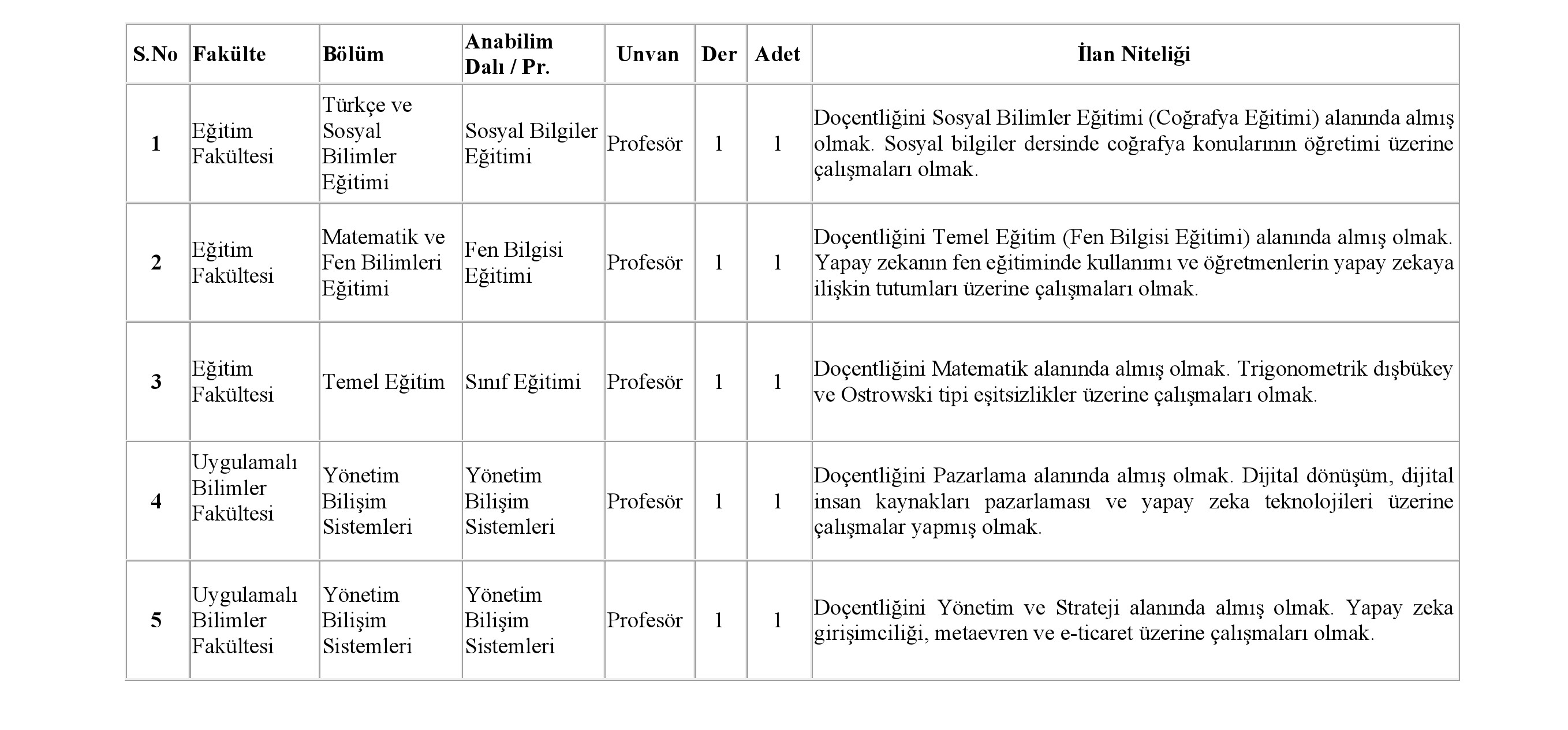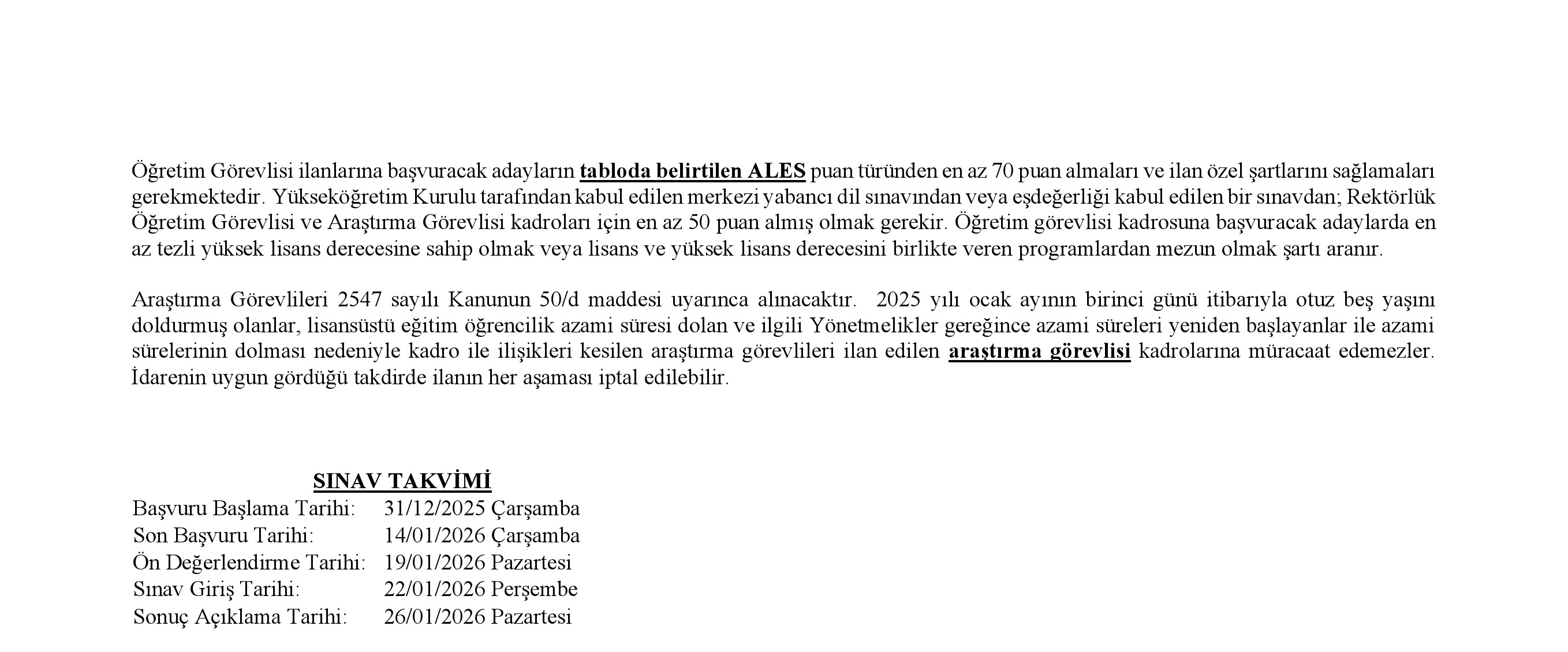 2547 sayılı Yükseköğretim Kanununun 23., 24. ve 26. maddeleri ve Yükseköğretim Kurulu Başkanlığınca onaylanan Üniversitemiz Öğretim Üyeliğine Yükseltilme ve Atanma Ölçütleri Yönergesi hükümlerine göre Üniversitemize öğretim üyeleri alınacaktır. İlan edilen kadrolara 2547 sayılı Kanunun Ek 38. Maddesi kapsamında başvuru alınmamaktadır.